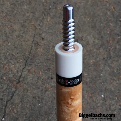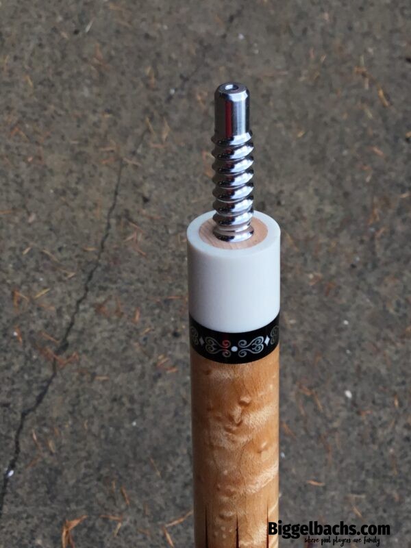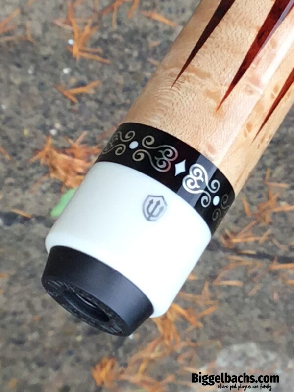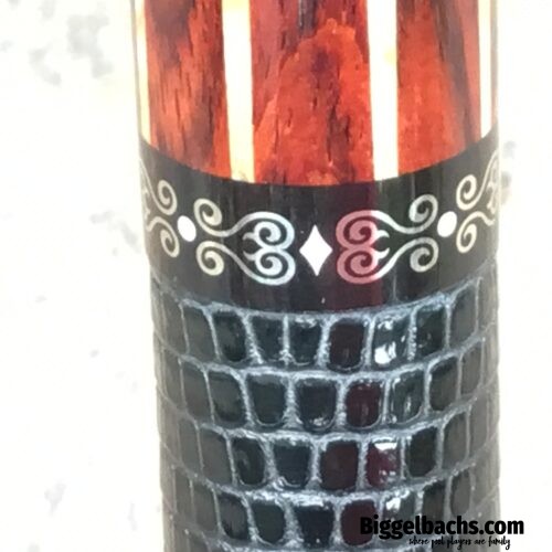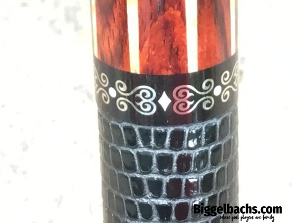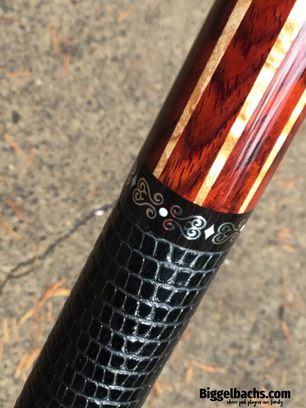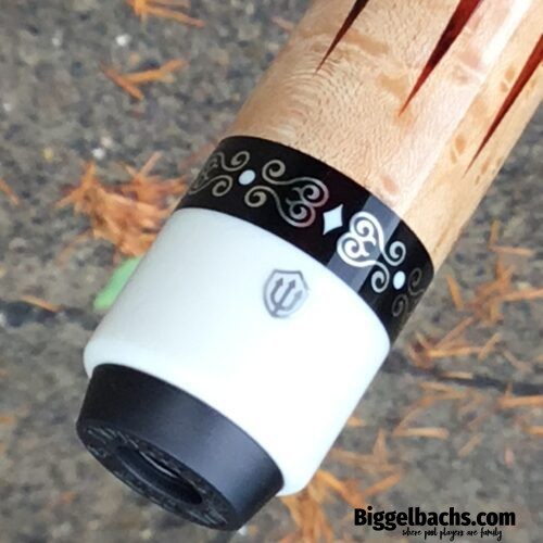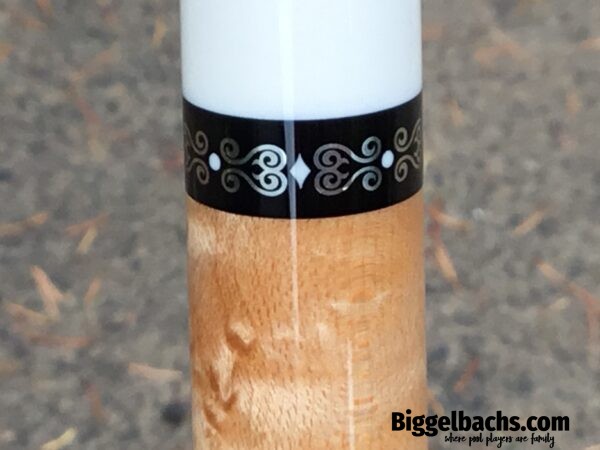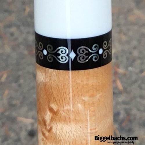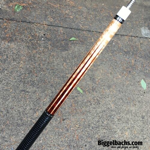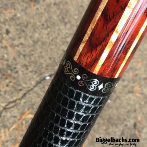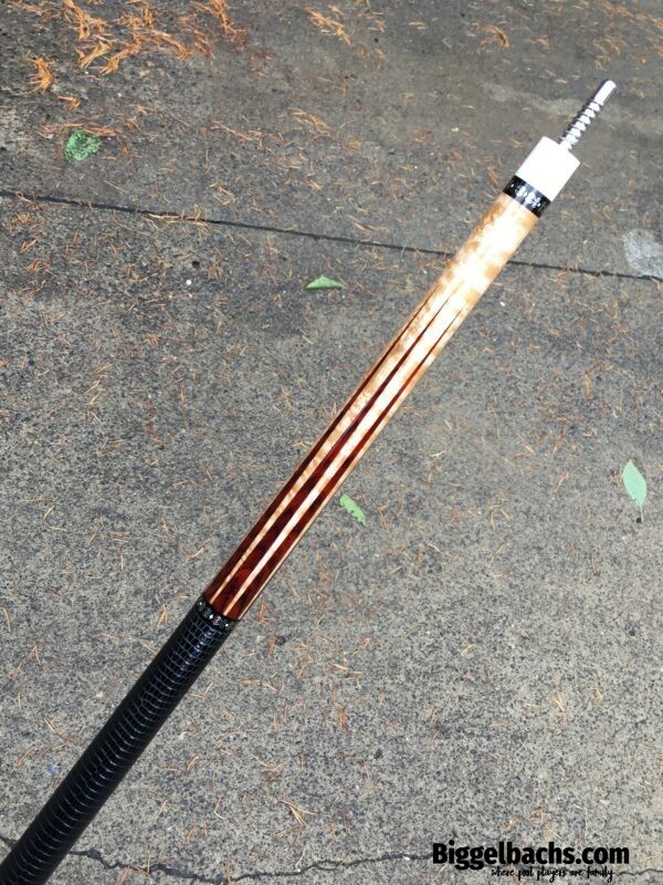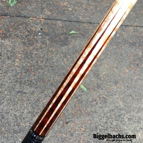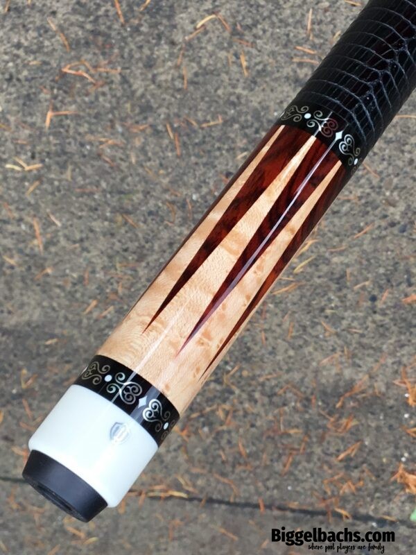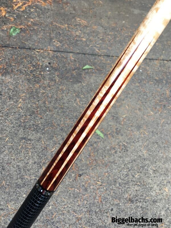 North Demon is quickly becoming a force in the custom cue world. This is an exceptional, close to traditional build with long cocobolo points into birdseye maple. The fancy collar-work compliments the build giving it an additional richness that takes it to the next level.