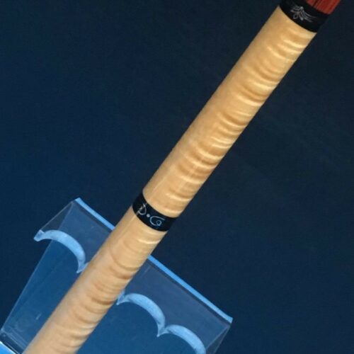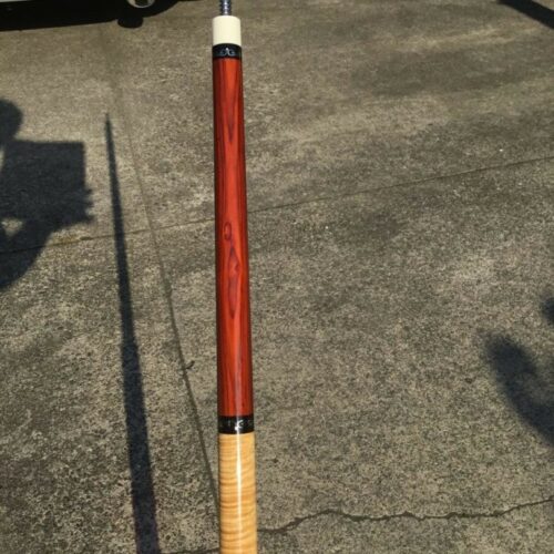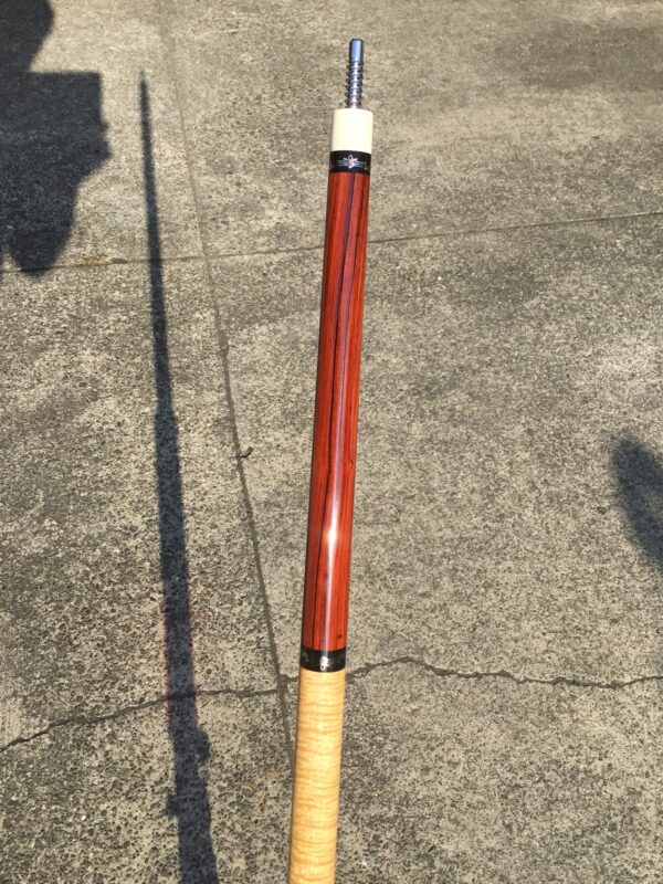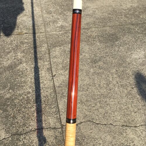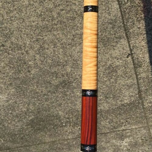Here we have a North Demon marriage of rich, handsome woods to beautiful, delicate collar work! North Demon is fast earning a reputation for his incredible collar work, and it is certainly showcased in this cue! He uses nickel silver and copper at the joint, butt cap and either side of the handle, then mixes it up with a different design collar in the middle of the handle – simply extraordinary!