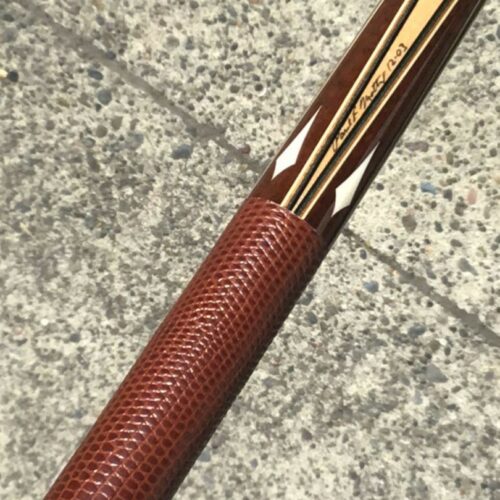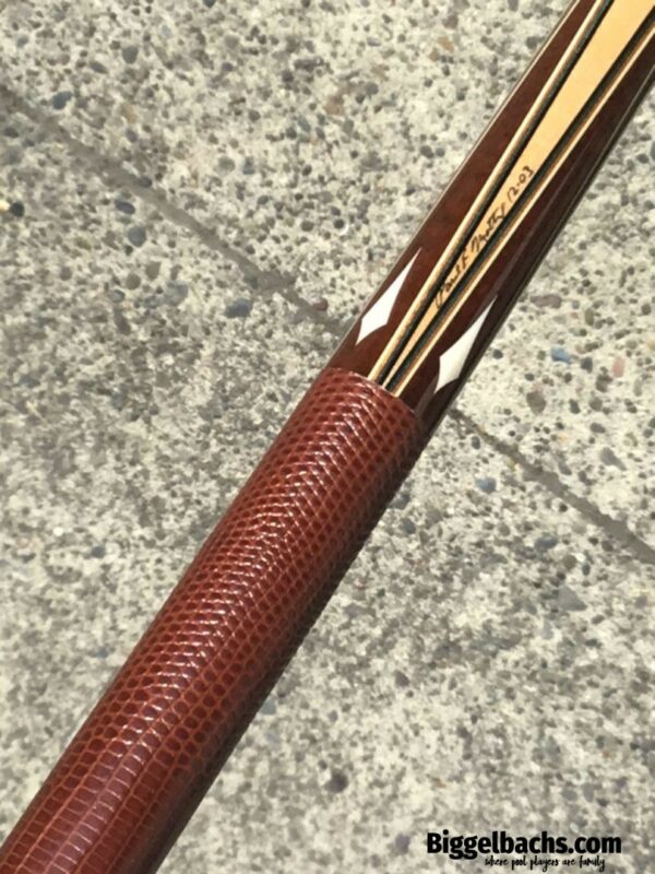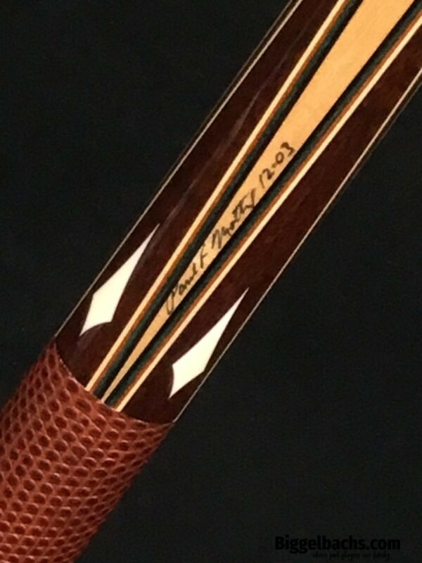 Paul Mottey cues can be tough to find. This Paul Mottey cue is spectacular!! In Mottey fashion, it has intricate inlays with the real stuff, a handsome lizard wrap and is just incredible!