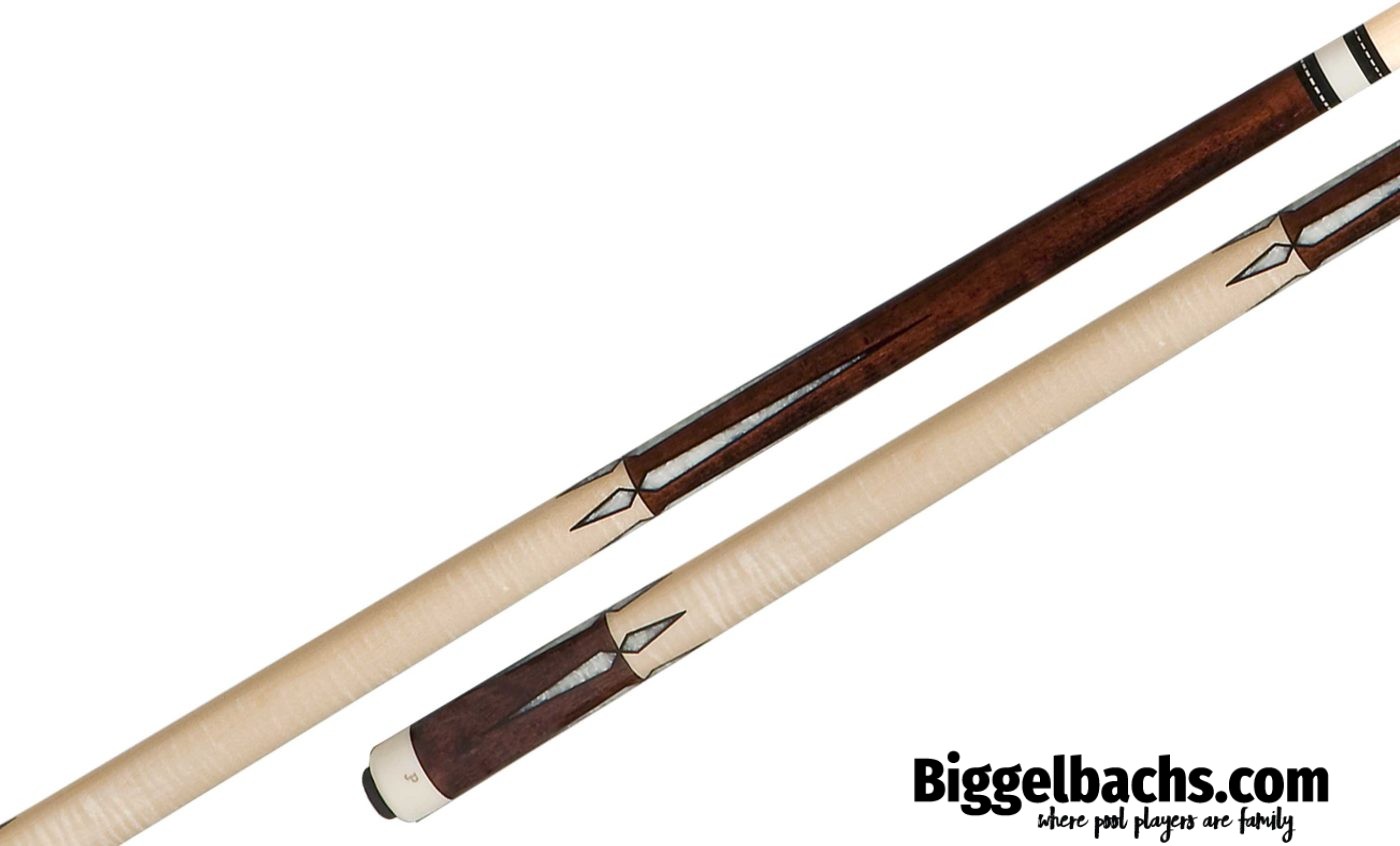 Rose-stained figured maple cue with ebony framed pearl points and inlays. No stain maple wrap. (Options to customize with other stain colors and/or wrap selections are available with minimal upcharges, contact Biggelbachs direct to coordinate your very own!)