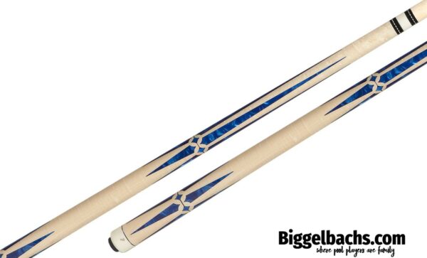 No stain figured maple cue and wrap with blue pearl diamond inlays and floating points. (Options to customize with other stain colors and/or wrap selections are available with minimal upcharges, contact Biggelbachs direct to coordinate your very own!)