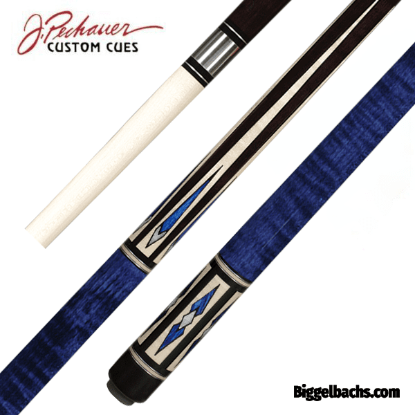 Ebony stained Maple cue with a Blue stained figured Maple wrap. No-stain Maple points with sim Ebony framed Blue Juma gem and Pearl inlays.