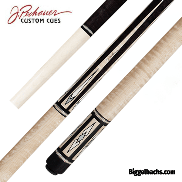 Ebony-stained maple cue with a no-stain figured maple wrap. No-stain maple points with sim. Ebony framed sim. Ivory and Pearl inlays.