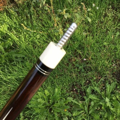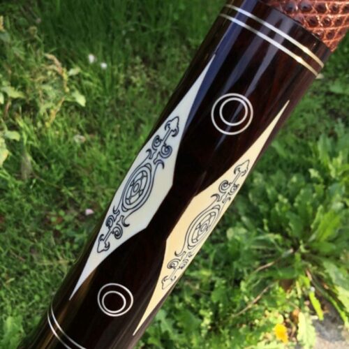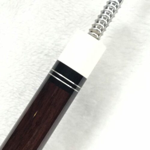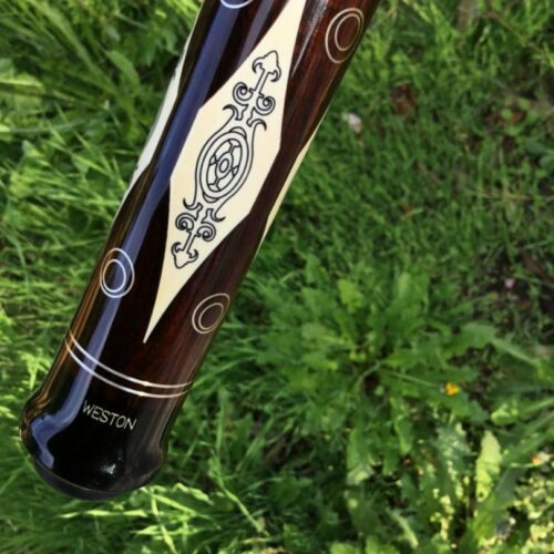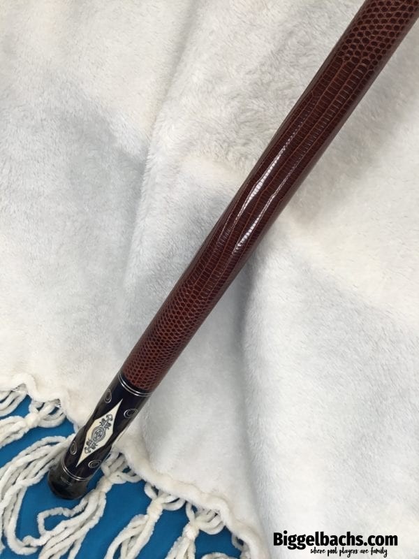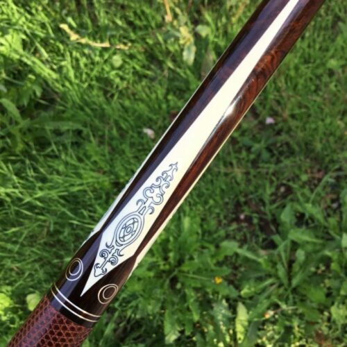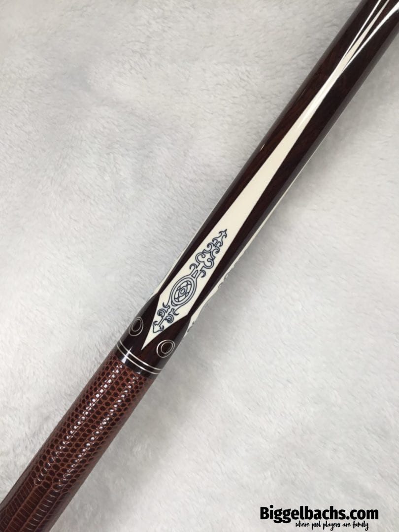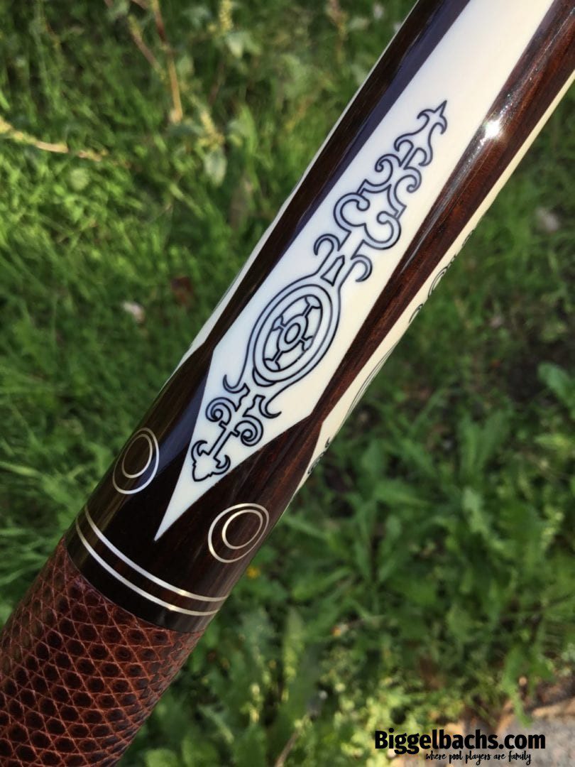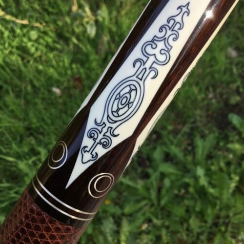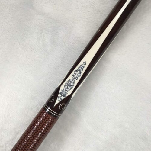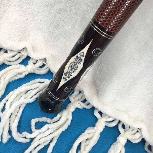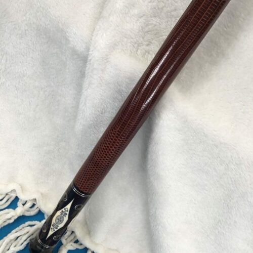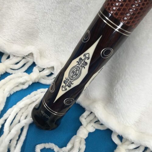 This Perry Weston custom pool cue is difficult to describe in words. The craftsmanship of this cue is very unique and finely detailed. It has ivory points, high and low with elegant scrimshaw work. There is sterling silver inlay work throughout the cue, with a brown leather wrap. To sum up this cue, the only word that makes sense is, “Wow!”