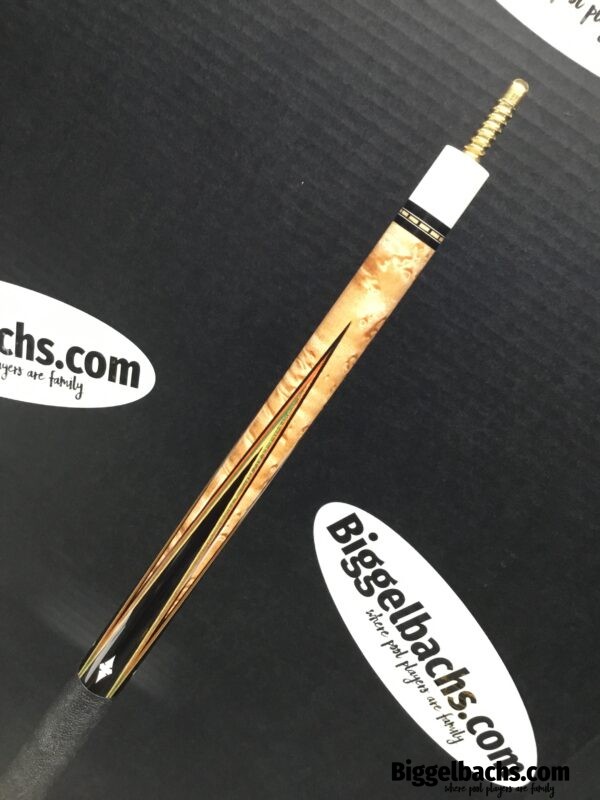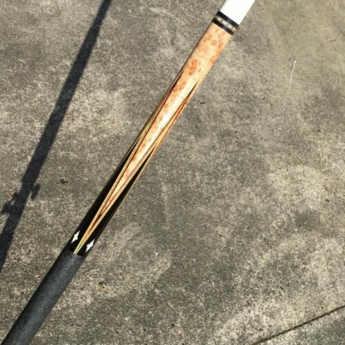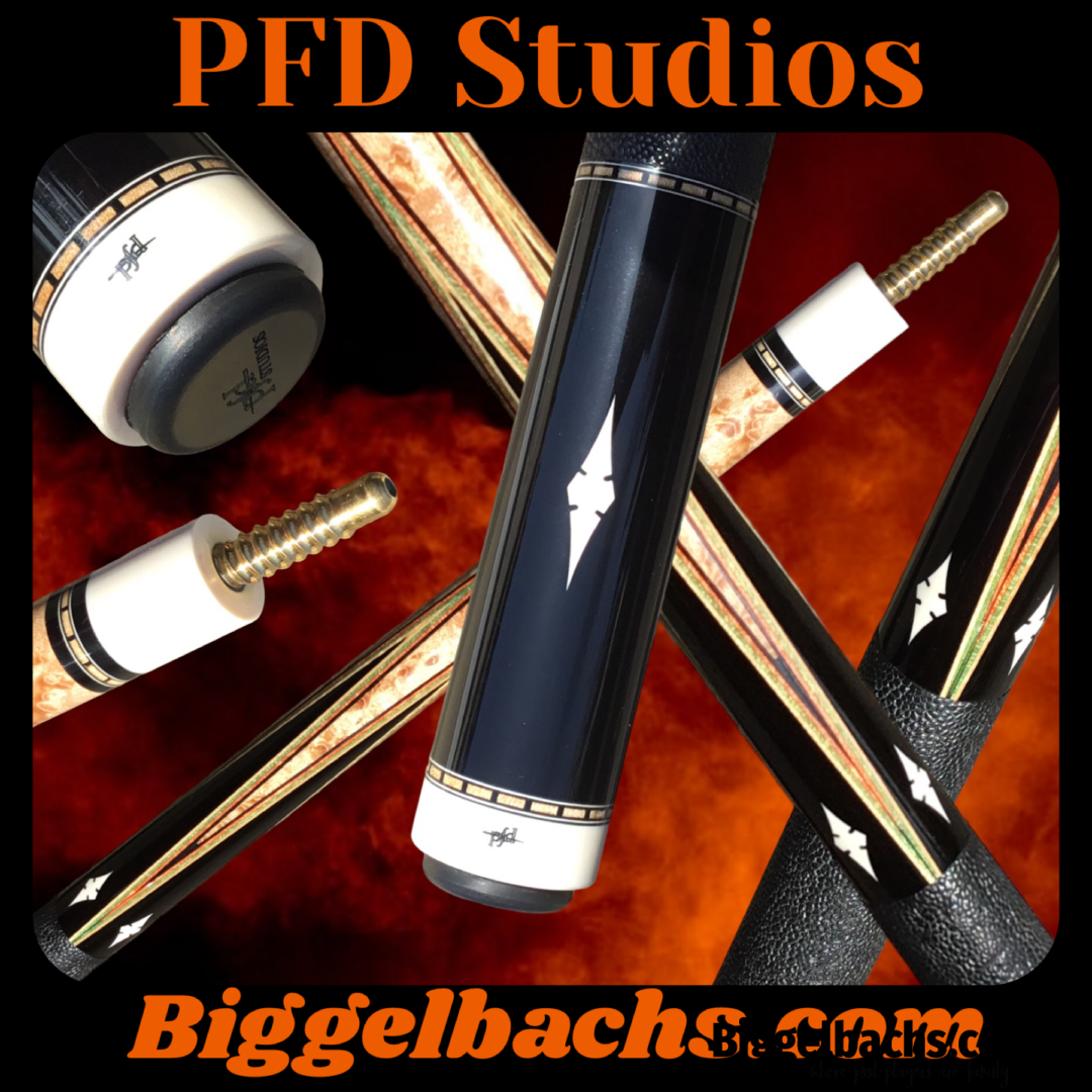 PFD Studio’s brings you this traditional custom cue build with 4 points, 4 veneers on Birdseye maple with a gorgeous elephant ear wrap. There are beautiful elongated diamond inlays in the points and butt sleeve, and the ferrules and joint boast natural material for added playability.