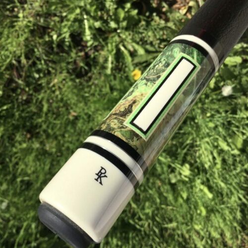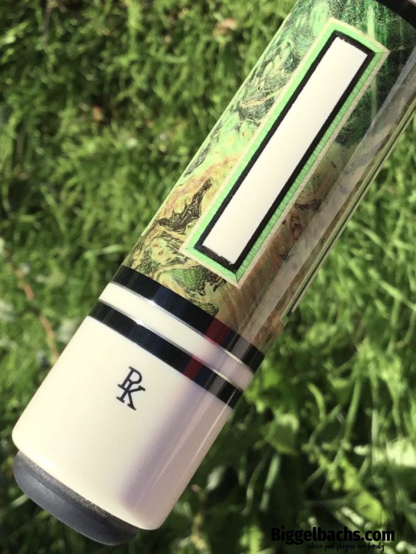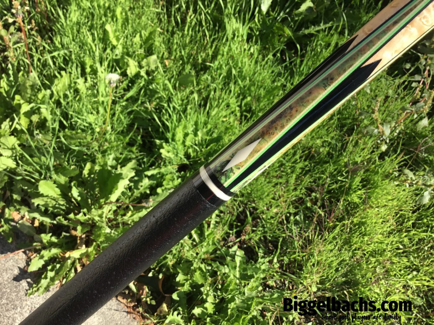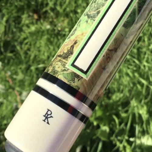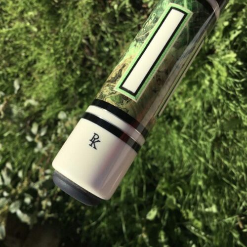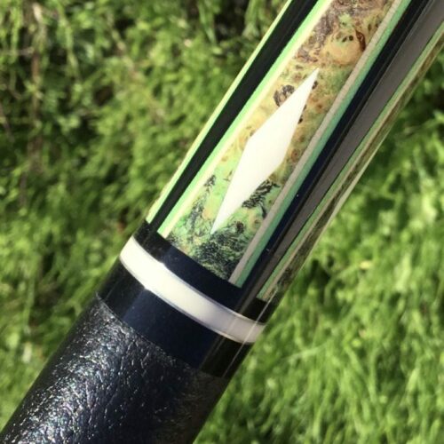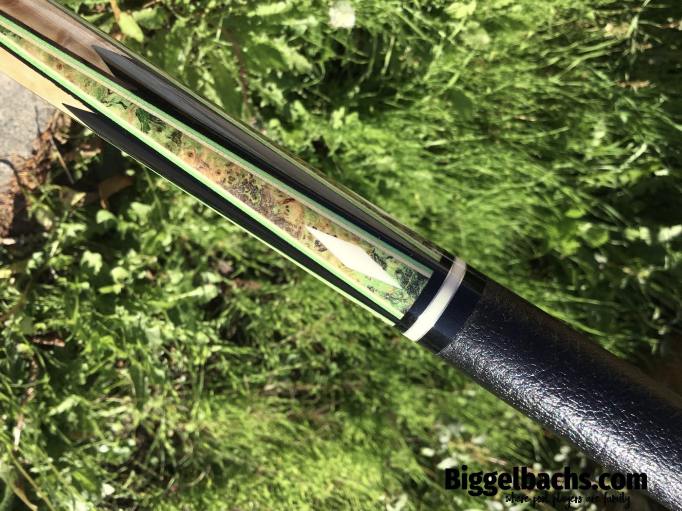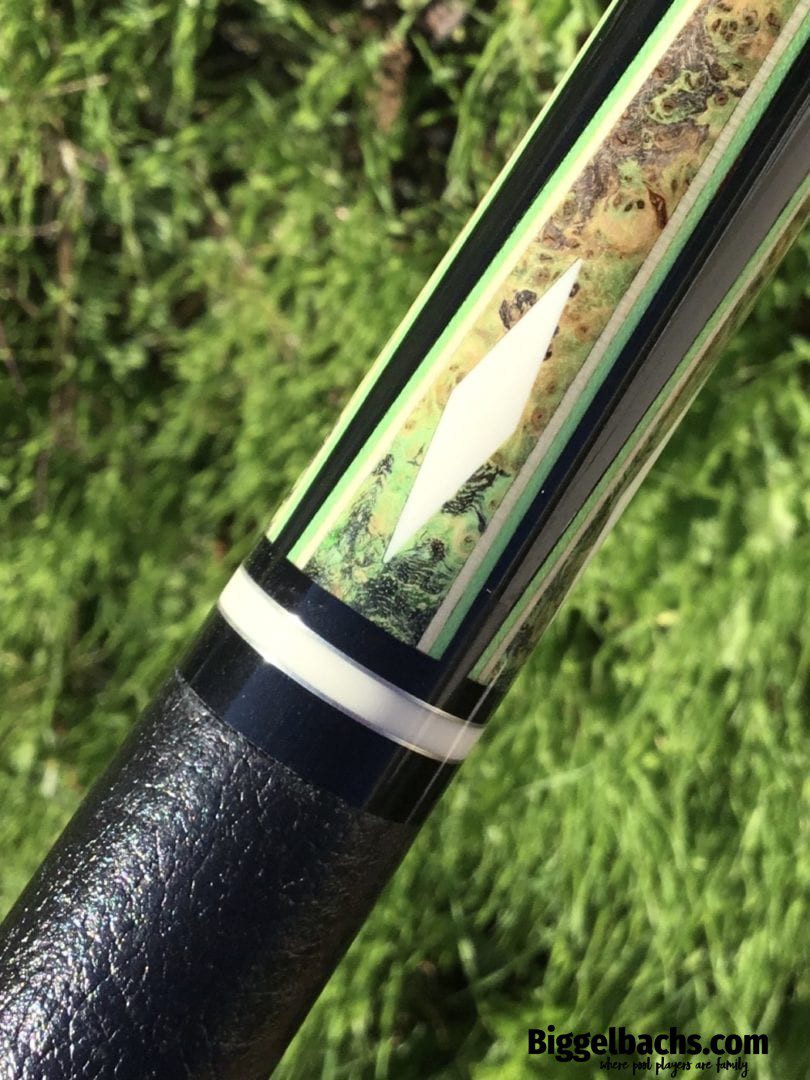 PK Custom cues made by Cody Cash. This stunning cue is made with a birdseye maple forearm and four veneered points. The points and butt sleeve of the cue are made with green stabilized burl, complimented by white accent inlays in sharp box windows. This cue is a masterful piece of cue making and we expect demand to rise for this craftsman.