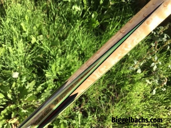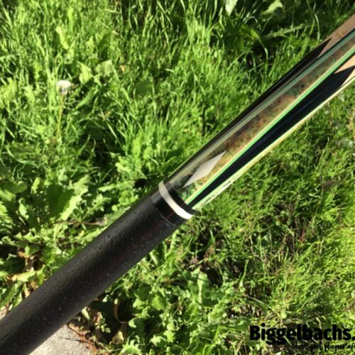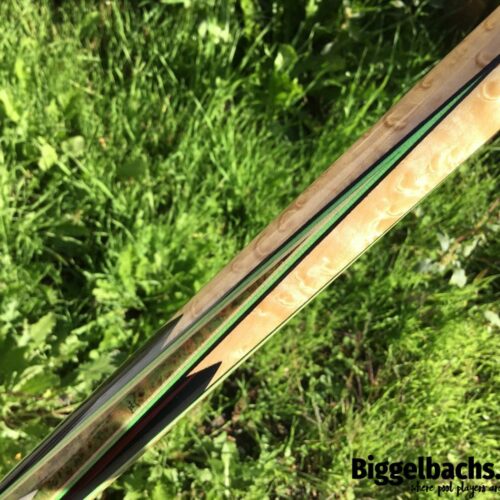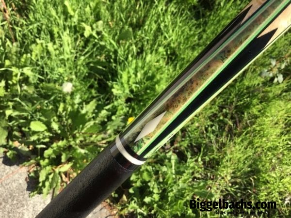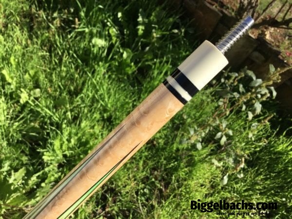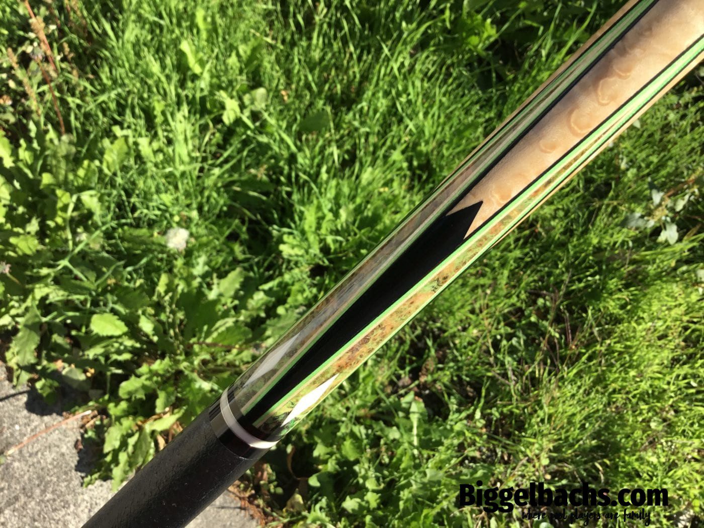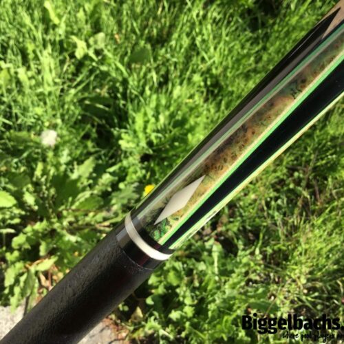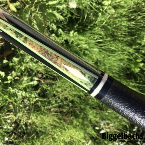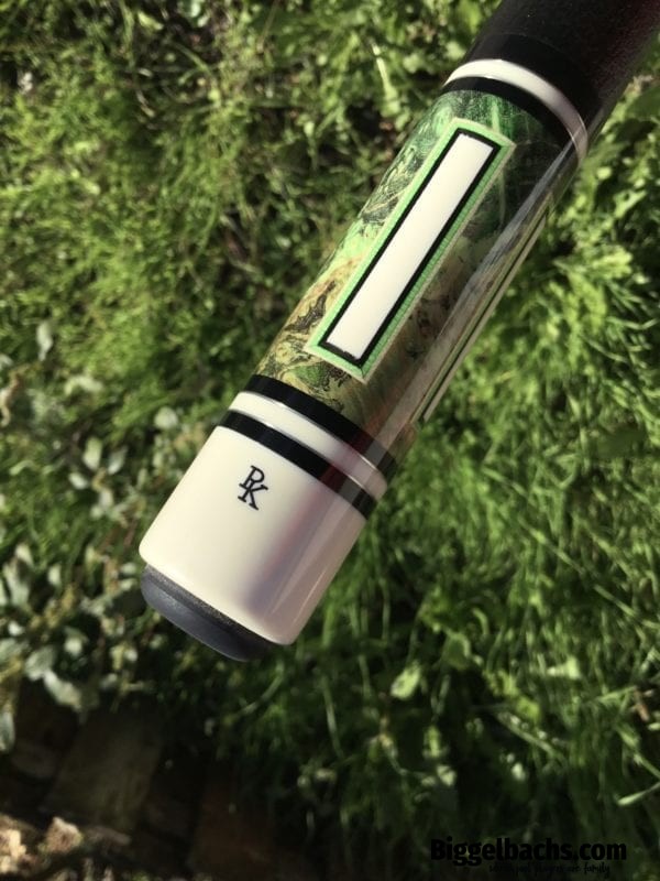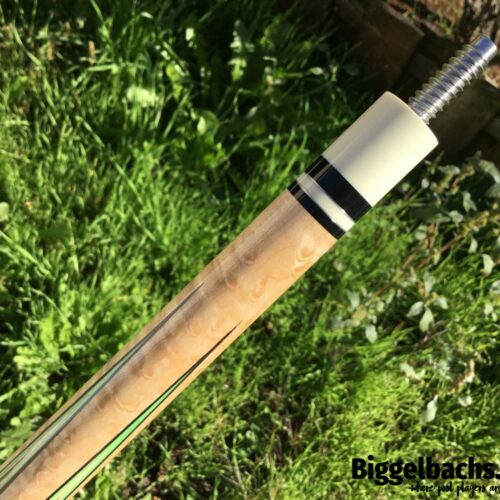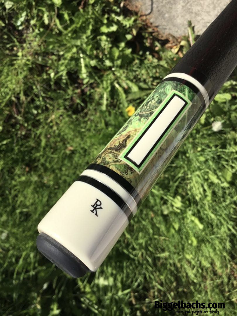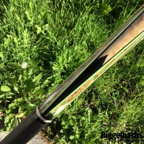PK Custom cues made by Cody Cash. This stunning cue is made with a birdseye maple forearm and four veneered points. The points and butt sleeve of the cue are made with green stabilized burl, complimented by white accent inlays in sharp box windows. This cue is a masterful piece of cue making and we expect demand to rise for this craftsman.
