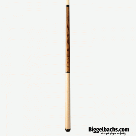 Sleek and simple natural Maple/Zebrawood half-and-half design jump/break cue with two quick-release joints, black Implex collar, sleek wrapless handle.
