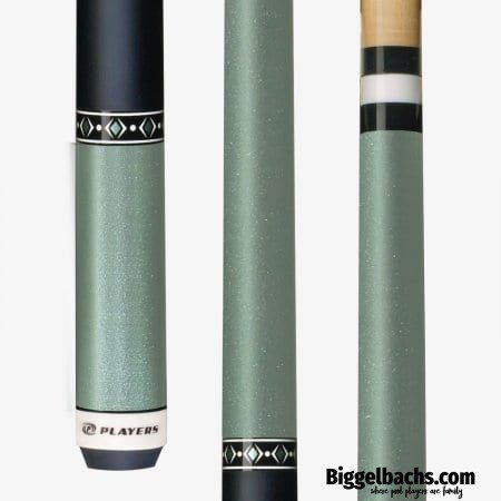 This new Players® cue features a metallic mint forearm and butt with decorative graphic overlay ring treatment, stealth matte finish wrapless handle, slimline Implex butt cap and classic 5/16 x 18 joint. Technology shaft upgrades available.