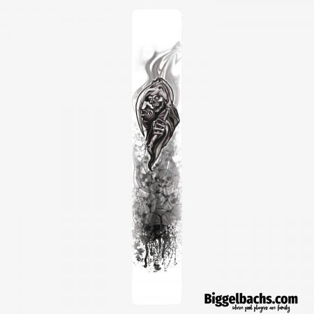 White forearm with greyscale reaper holding an 8-ball on a pile of skulls and a black back-end loaded rubberized grip with skull Mz Multi-Zone traction pattern, stainless steal joint collar and black slimline butt cap.