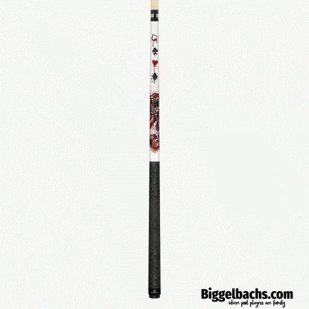 White forearm with wicked pool playing jester, dripping card suits and a black back-end loaded rubberized grip with skull Mz Multi-Zone traction pattern, stainless steal joint collar and black slimline butt cap.