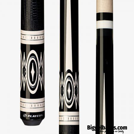 This modern classic Players® cue features a midnight black forearm & butt with graphic four-point white & silver geometric diamond and oval design, white & silver banded hashed rings, black lizard print embossed leather wrap, slimline butt cap and classic 5/16 x 18 joint. Technology shaft upgrades available.