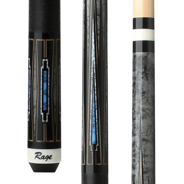 Introducing the New 2021 Rage series. This bold and modern Rage cue features 100% Hard Rock Maple construction, Grey Stained Maple, Birdseye, Zebrawood, Blue & White Recon Graphic, and Double Pressed Nylon Wrap.