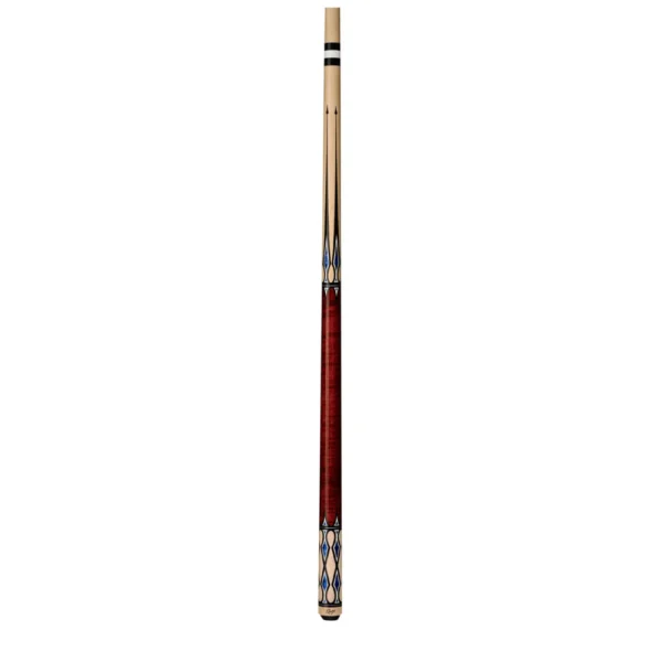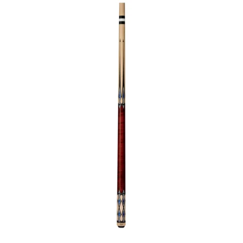 This modern traditional Rage cue features 100% Hard Rock Maple construction with natural Maple forearm and butt, graphic black and white points with blue diamond accents, Implex joint and sleek wrapless handle.