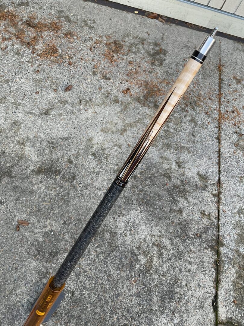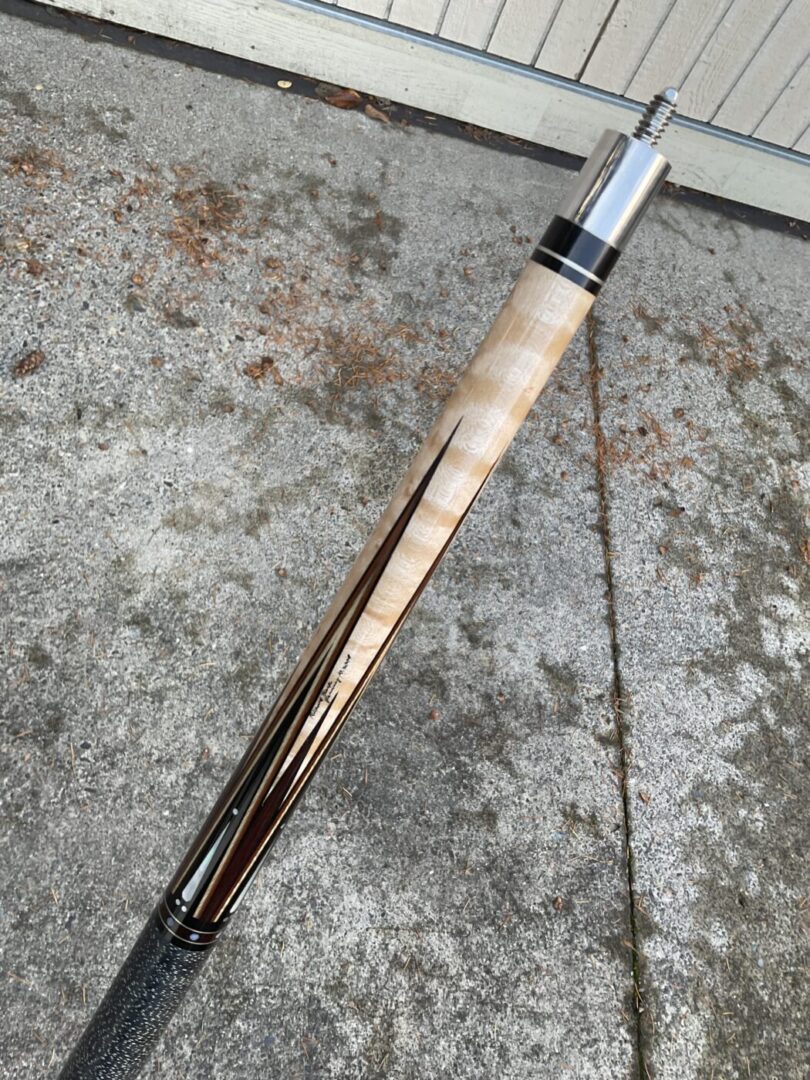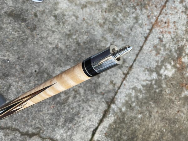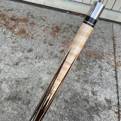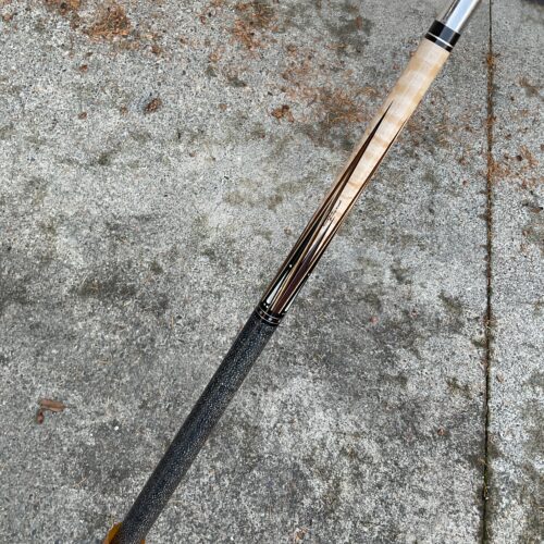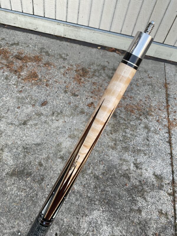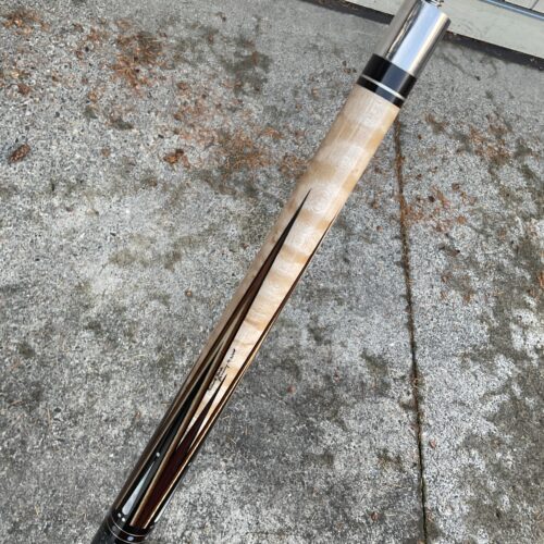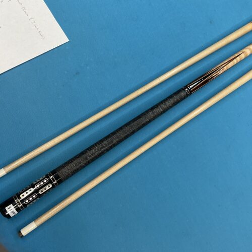 Made by hall of fame cue maker Richard Black, this cue blends traditional with unique providing the best of both worlds! We called it the Domino cue based on the framed and reversed dot inlays in the butt. The forearm is fiddleback maple with 8 high-low points, veneers and attractive mother of pearl inlays in the ebony points.