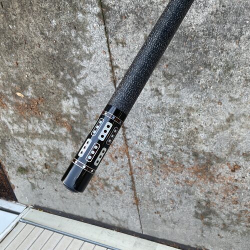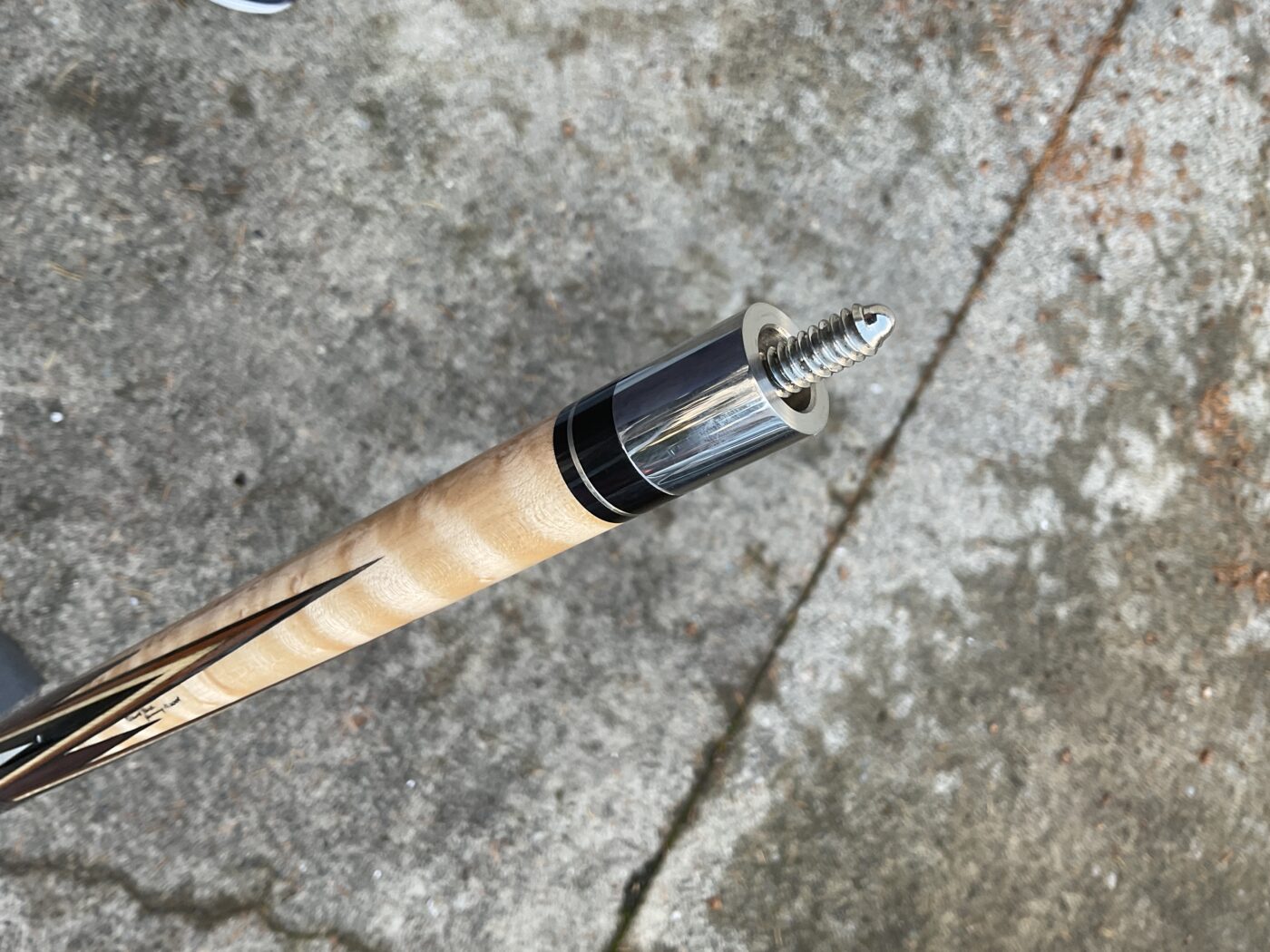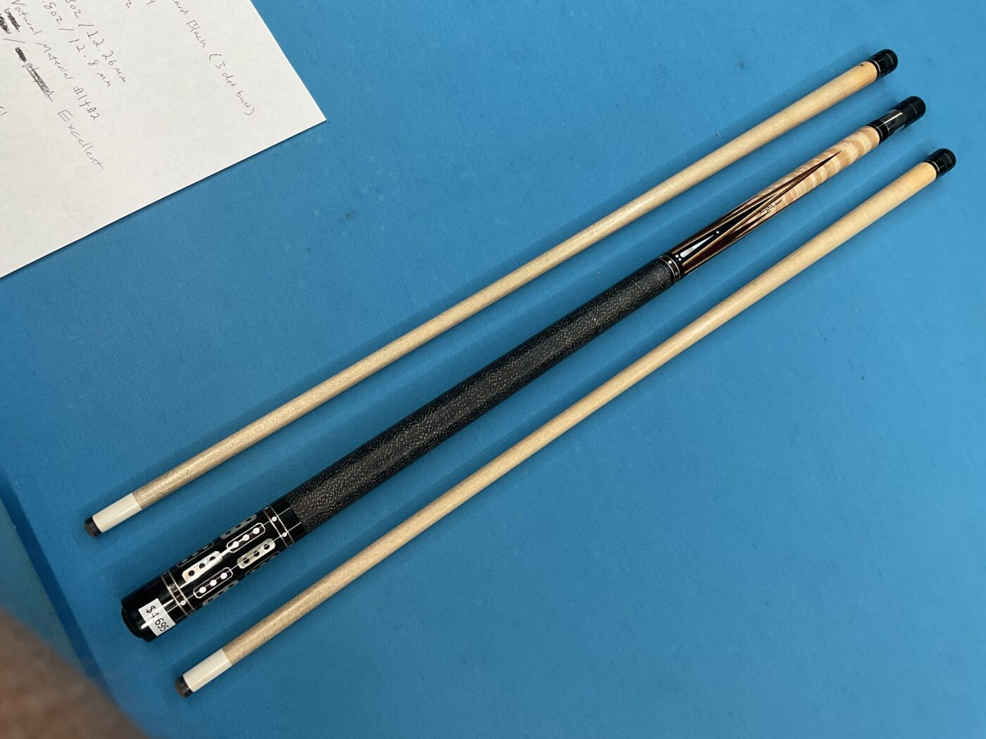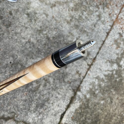 Made by hall of fame cue maker Richard Black, this cue blends traditional with unique providing the best of both worlds! We called it the Domino cue based on the framed and reversed dot inlays in the butt. The forearm is fiddleback maple with 8 high-low points, veneers and attractive mother of pearl inlays in the ebony points.