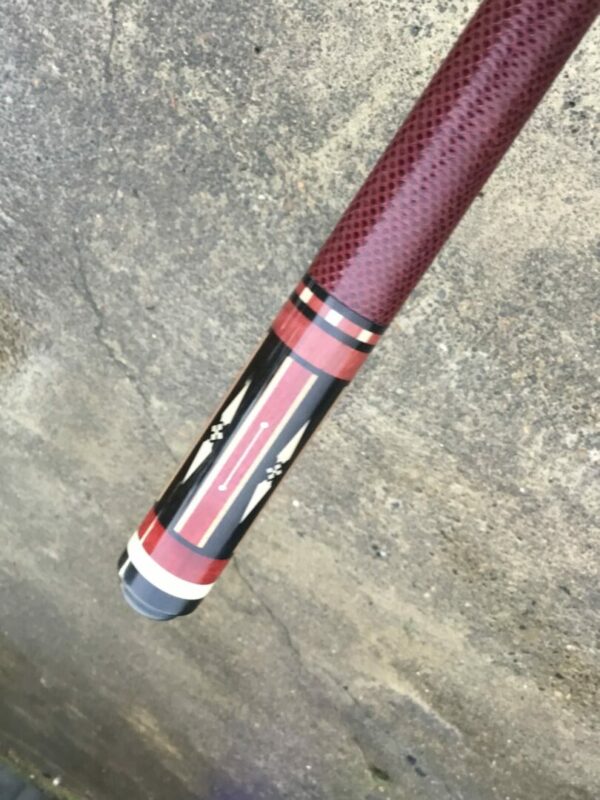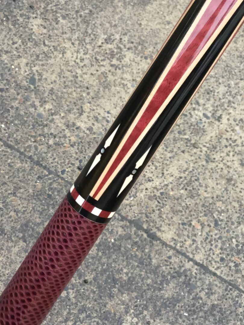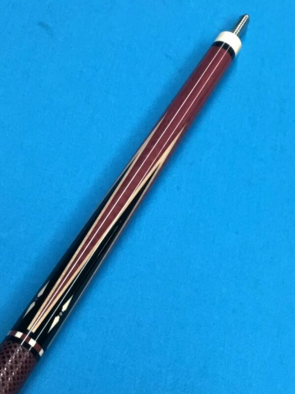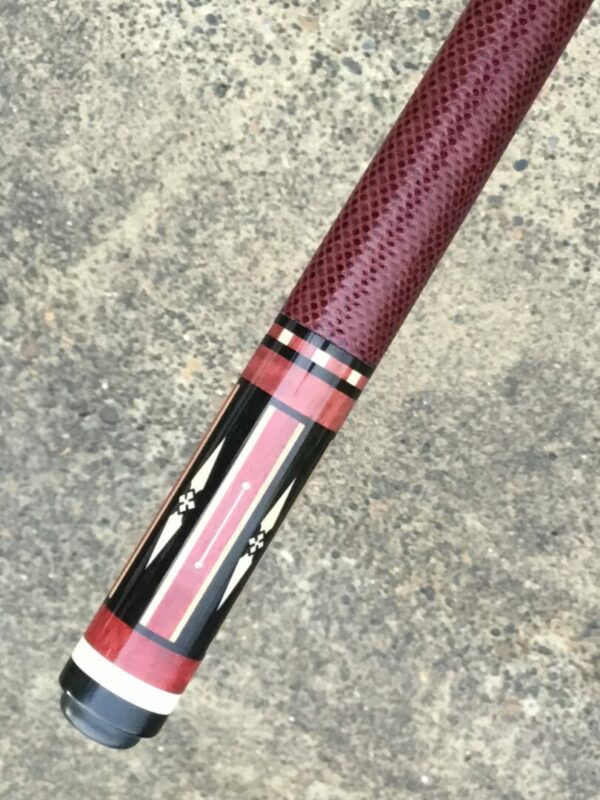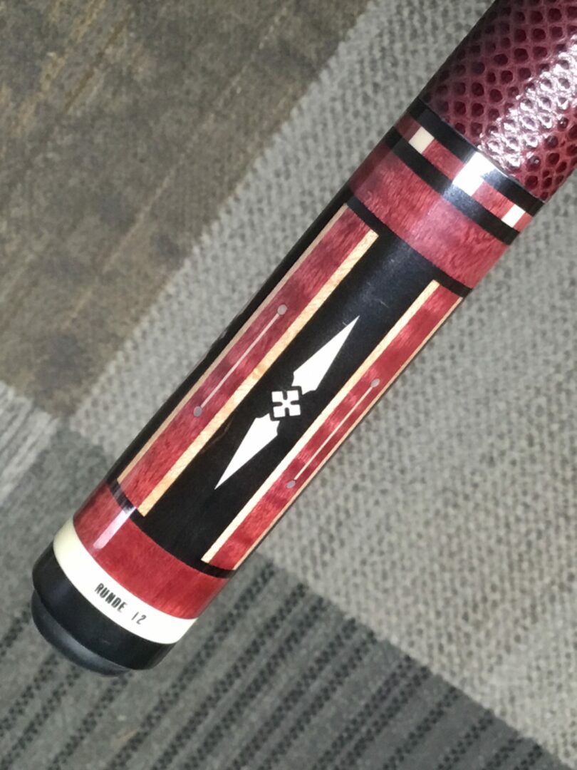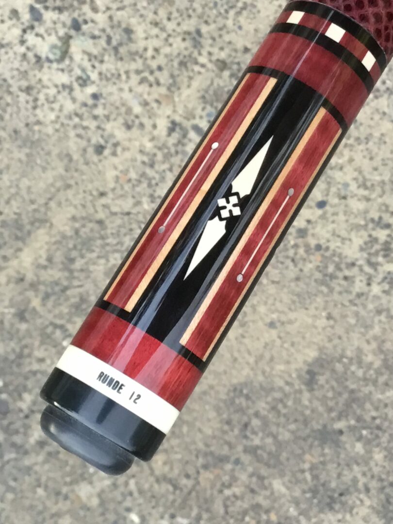 You can’t go wrong with this stunning Purple Heart cue with its ebony points and boxes in the butt sleeve. Further accented with complimenting inlays that Bob Runde is renowned for, the burgundy leather wrap ties the design together for one very classy cue.