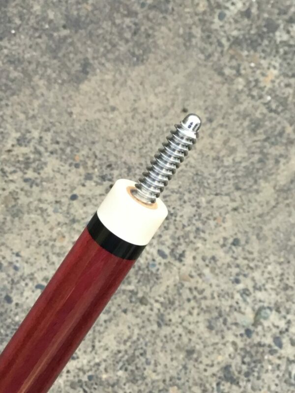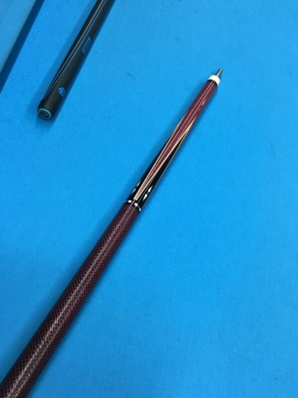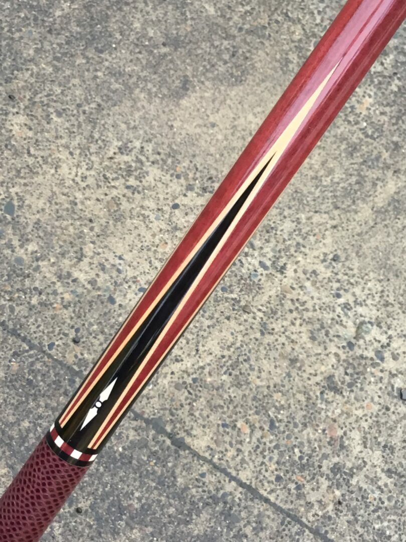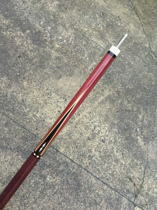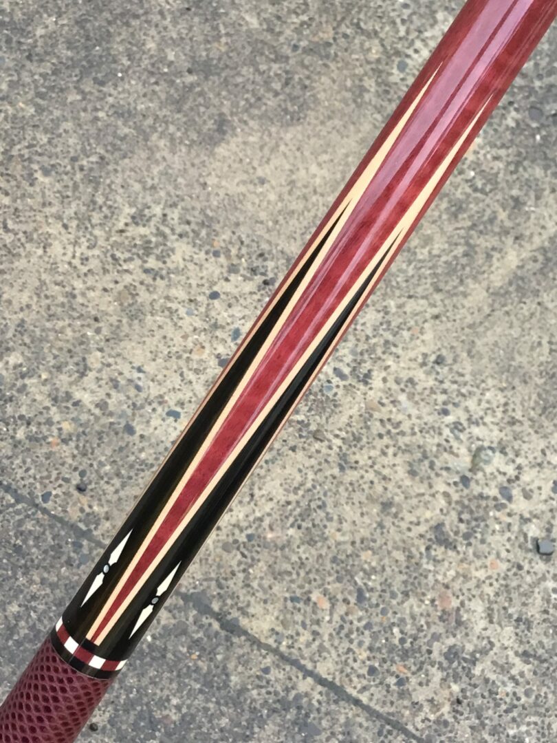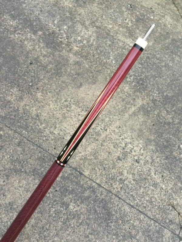You can’t go wrong with this stunning Purple Heart cue with its ebony points and boxes in the butt sleeve. Further accented with complimenting inlays that Bob Runde is renowned for, the burgundy leather wrap ties the design together for one very classy cue.