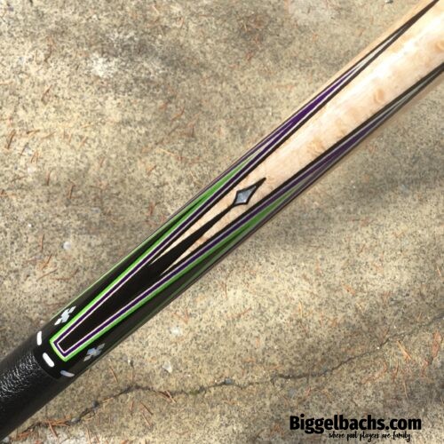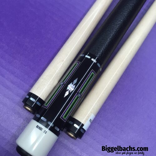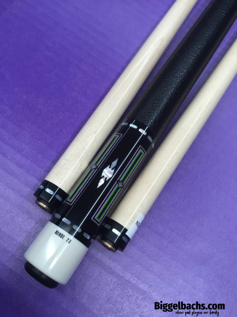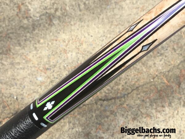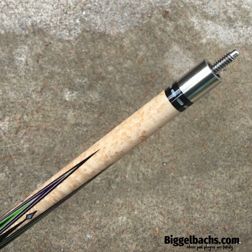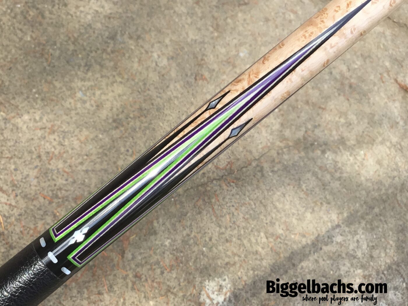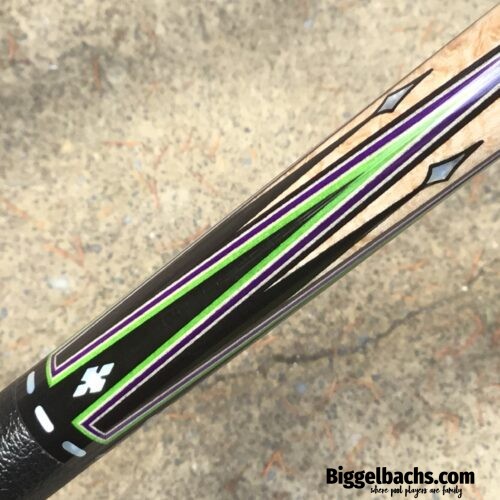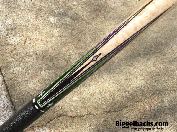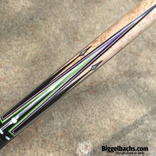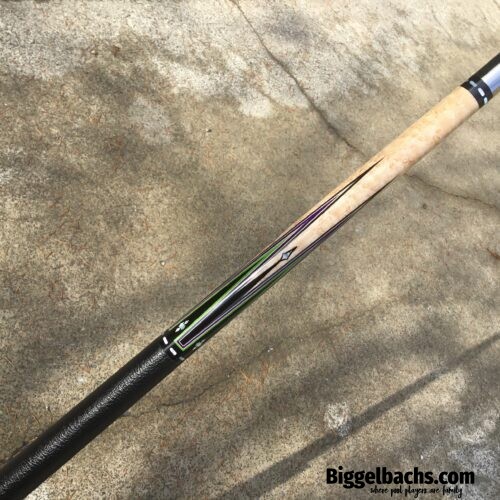 If you’re a fan of Runde’s, definitely check out the various pics on this one because it won’t last! The blue and green veneers in this 8 point beauty make this cue next level stunning! Classic Runde styling and inlays make it obvious that this is a Runde, but the blue and green veneers look like neon and take this cue to the next level!