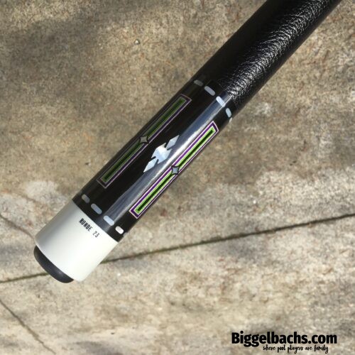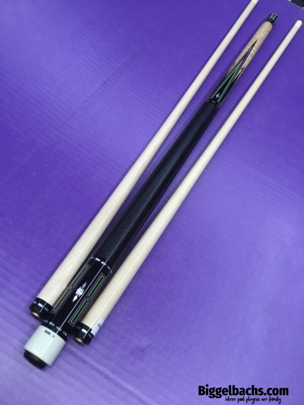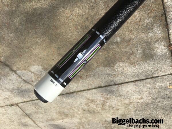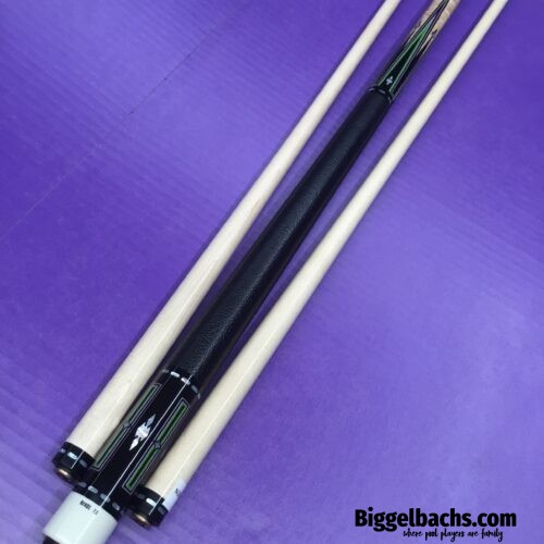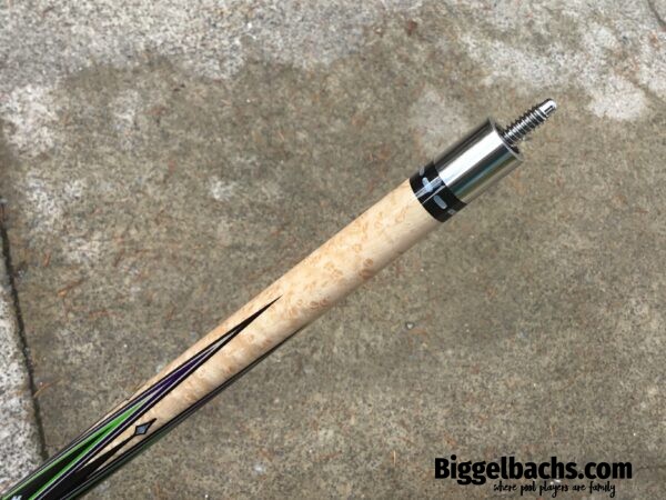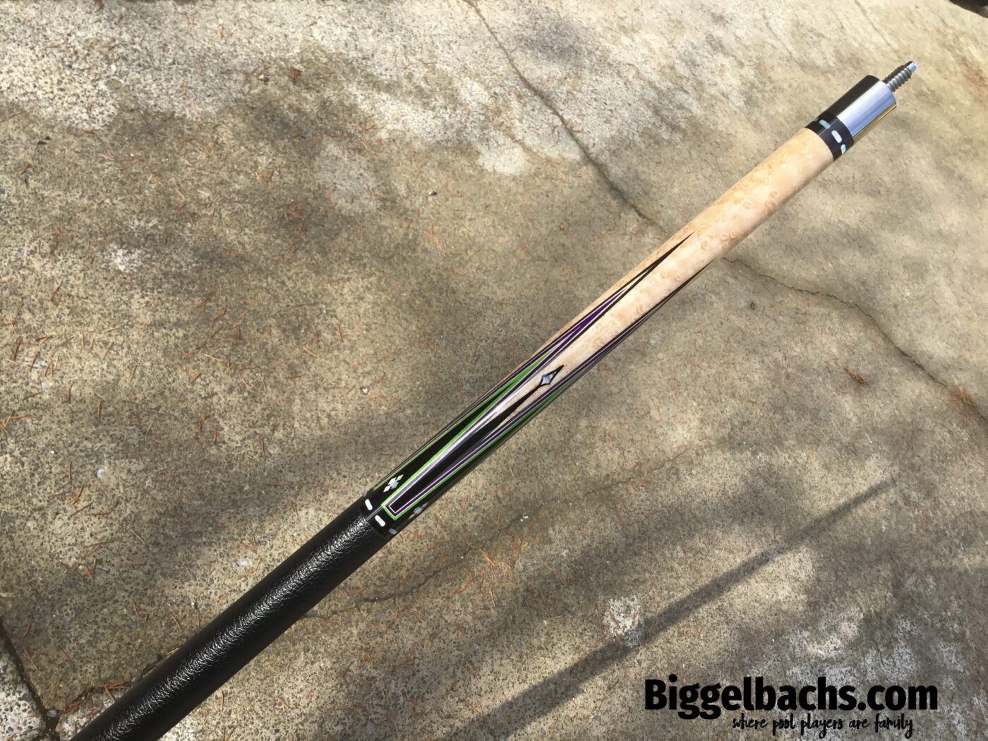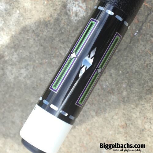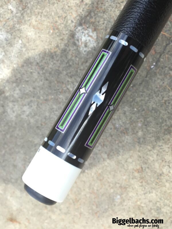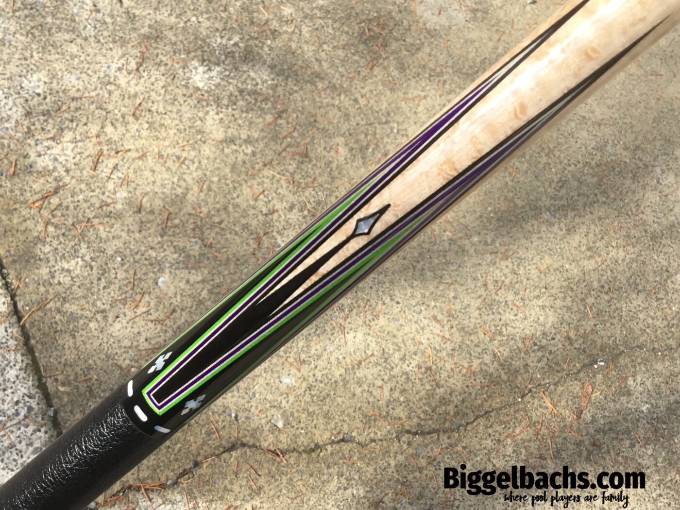 If you’re a fan of Runde’s, definitely check out the various pics on this one because it won’t last! The blue and green veneers in this 8 point beauty make this cue next level stunning! Classic Runde styling and inlays make it obvious that this is a Runde, but the blue and green veneers look like neon and take this cue to the next level!