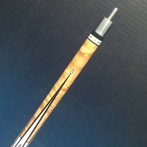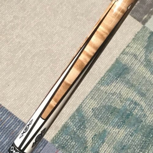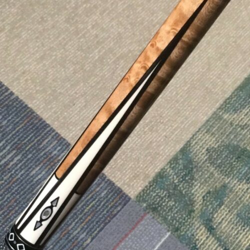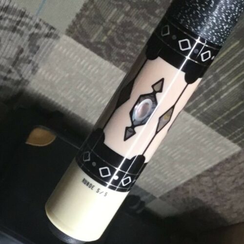 This Runde custom pool cue is one sweet build with inlays that look like pieces of old fashioned hard candies in wrappers. The design is carried throughout the cue in the ivory points and window in the butt sleeve. The abalone and mother of pearl elements compliment the cue beautifully. We’re surprised Bob put a linen wrap on such a big cue, but it is just gorgeous, gorgeous, gorgeous!!