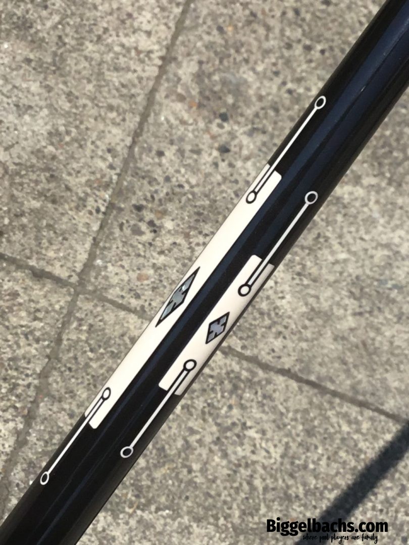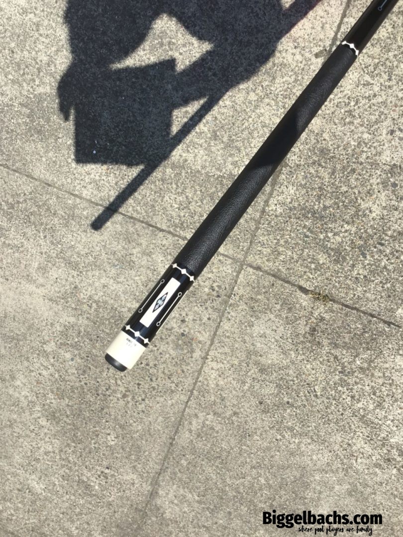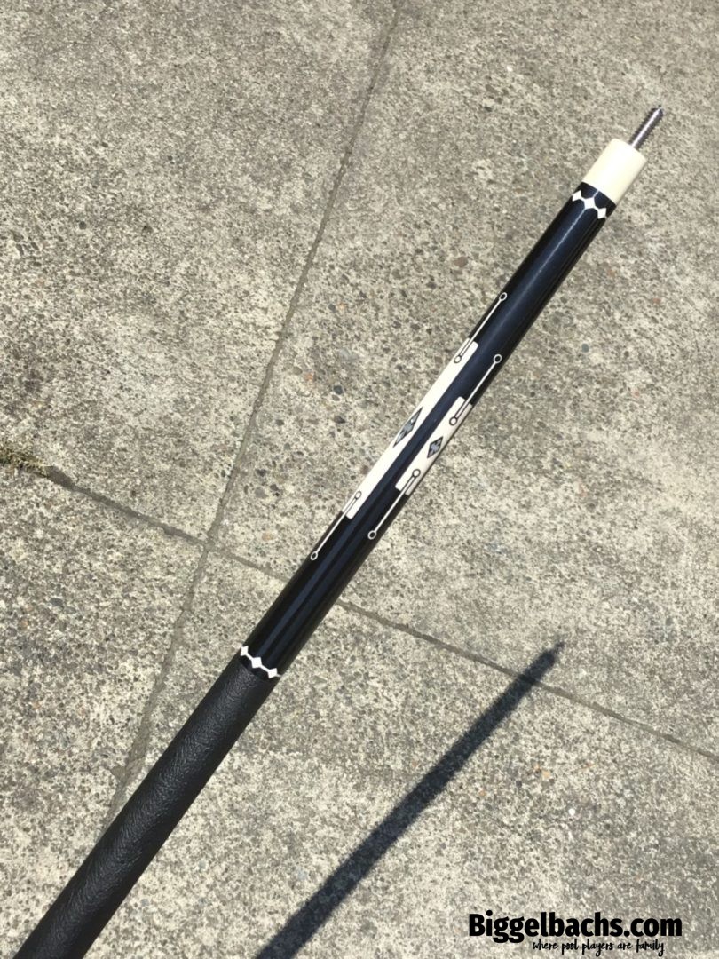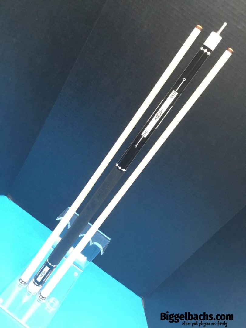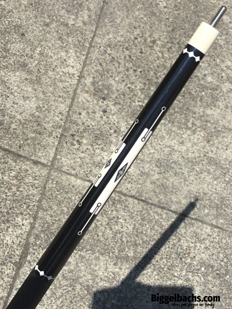 This tuxedo box cue can not fully be described in words alone, it’s stunning. The white boxes with mother of pearl diamond inlays are absolutely brilliant. The design is carried on through the butt sleeve and is complimented with beautiful collar work and a handsome black leather wrap.