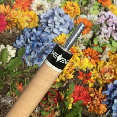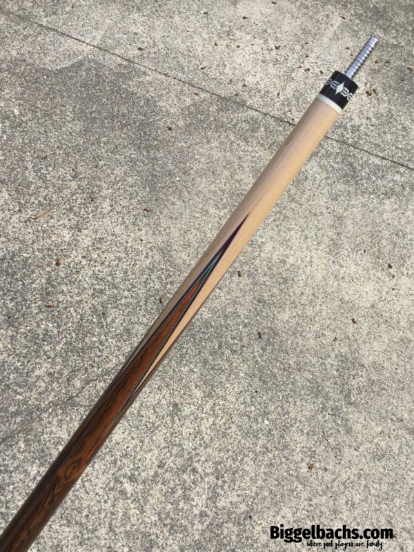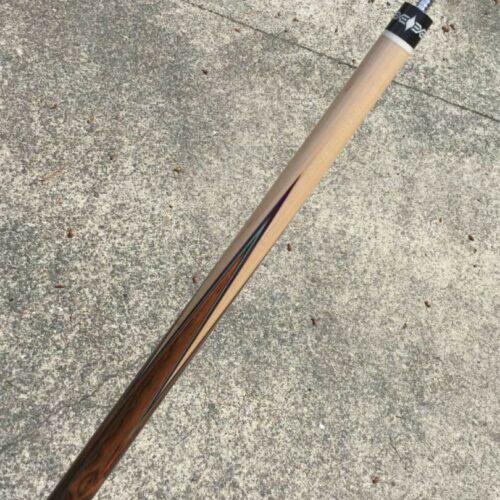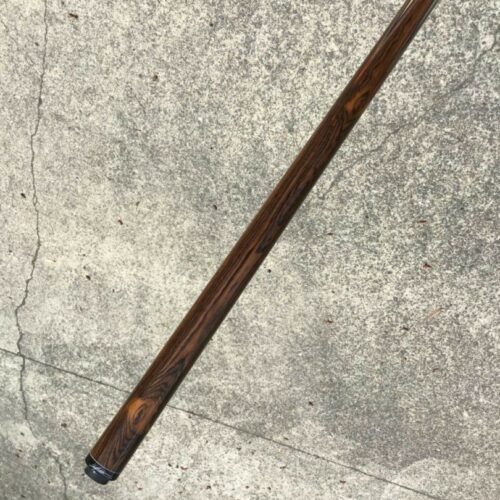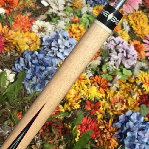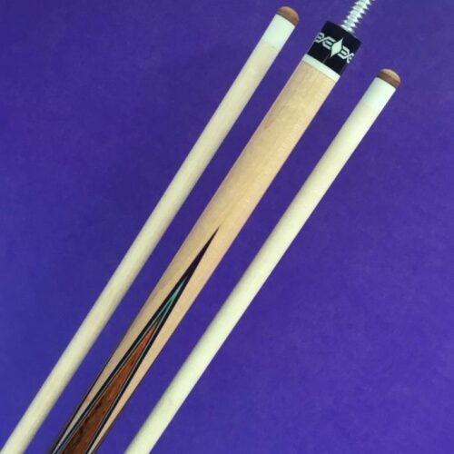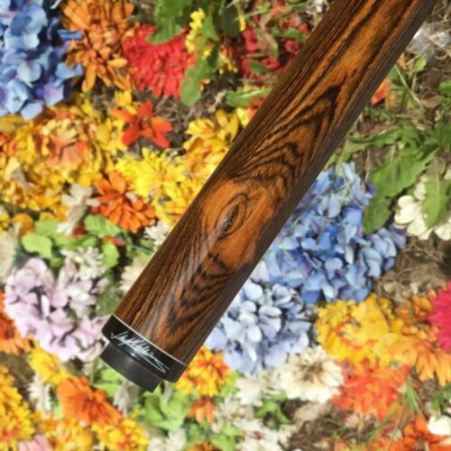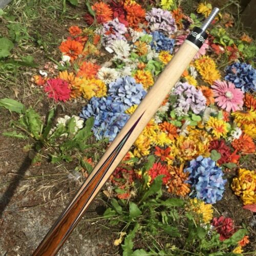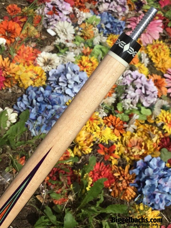 This Shelby Williams beauty will need a close examination to truly appreciate all the gorgeous touches! Williams started with a Maple-Bacote full splice with orange, black, green and black veneers. Staying true to the richness of the wood, Shelby opts to utilize the “less is more” philosophy and finishes off the build with his signature unique ring work. It also is unique in that it is a 60″ cue (split 30″/30) and will definitely make one special player verrrry happy!