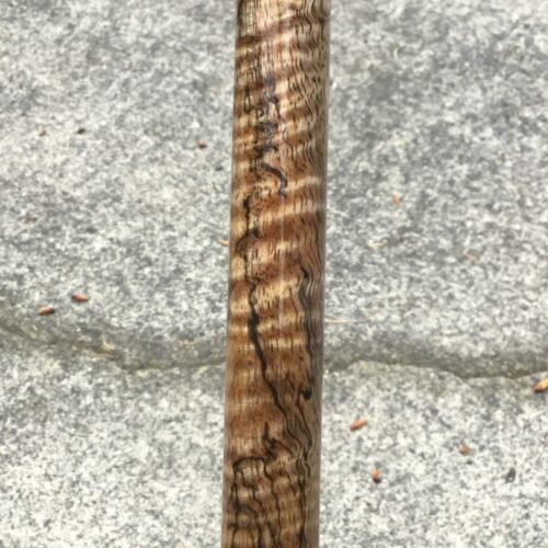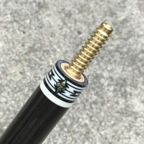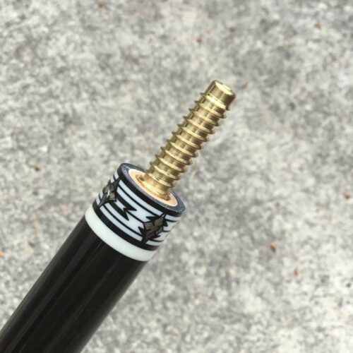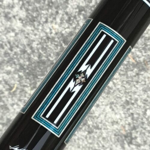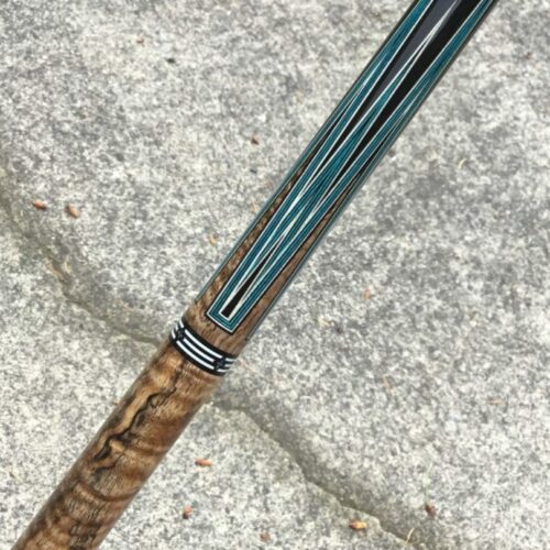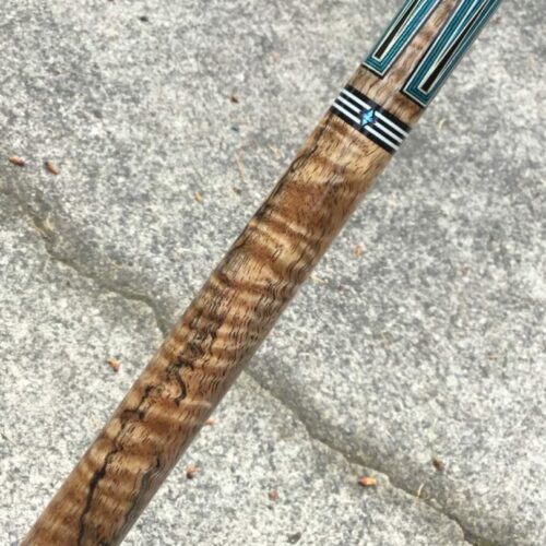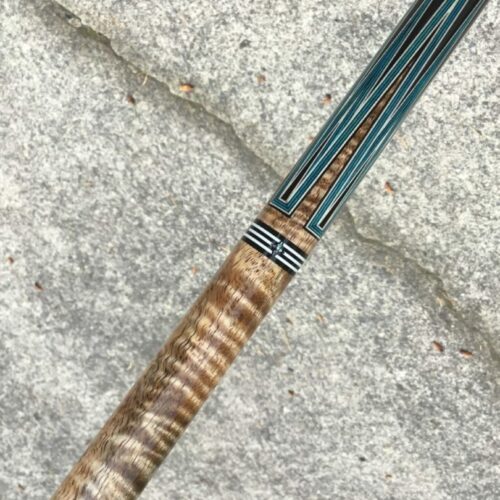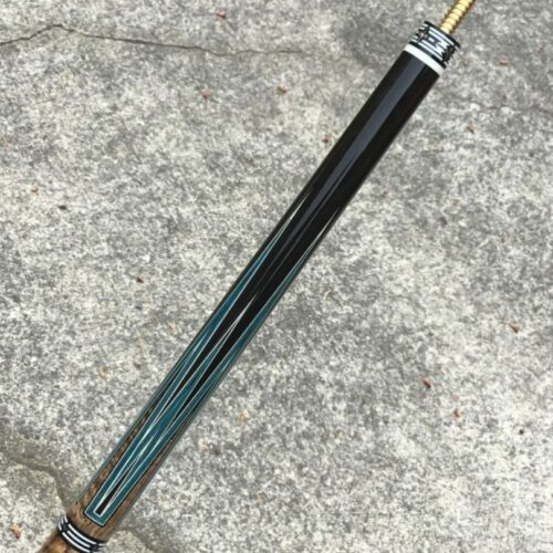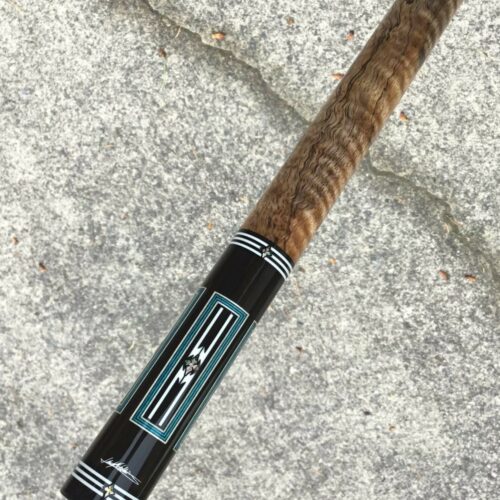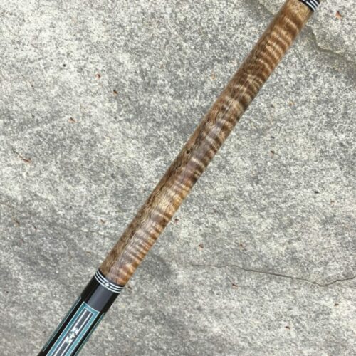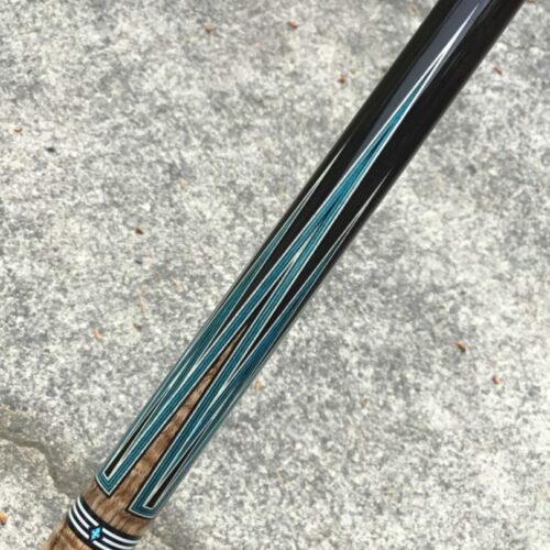 Another incredibly striking cue built by Shelby Williams. Shelby used an exotic piece of Curly Mango with unique traces of spalting as the handle of this forearm giving this cue a life of its own. Williams then framed the in the Mango handle with 8 high-low bridge points outlined with 4 Juma and Sky Blue veneers into a deep Ebony forearm. He complimented the contrast from the handle to the butt and forearm of the cue with ring-bands inlaid with a delicate Abalone diamond that can also be found in the more intricate joint ring work. As if all that work isn’t enough, it is perfectly finished with matching box windows with Juma and Abalone inlays in the butt.