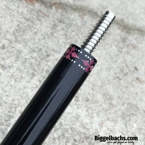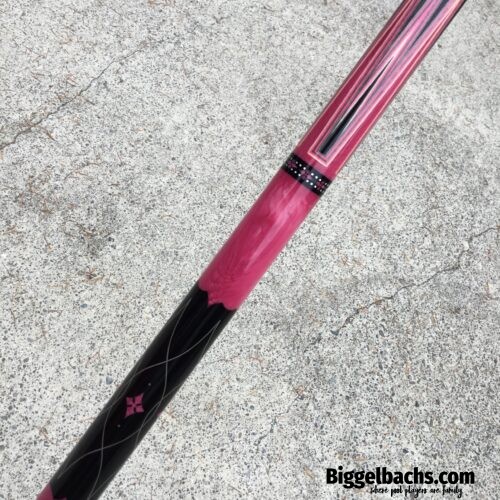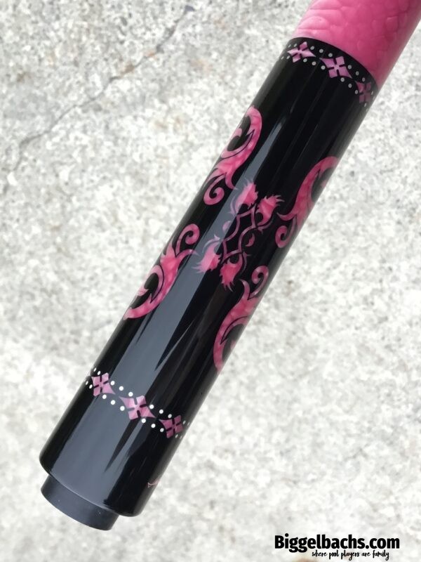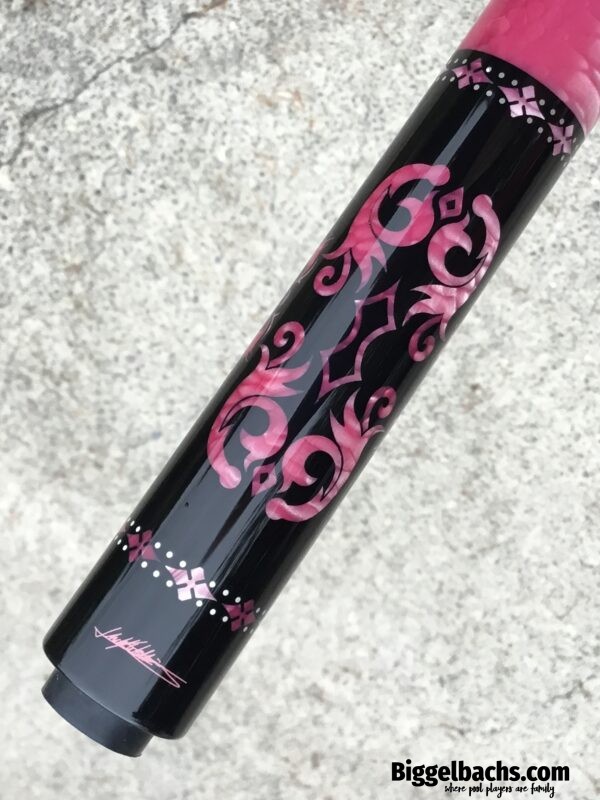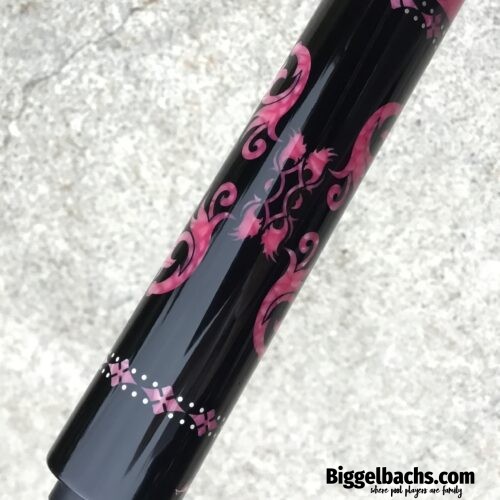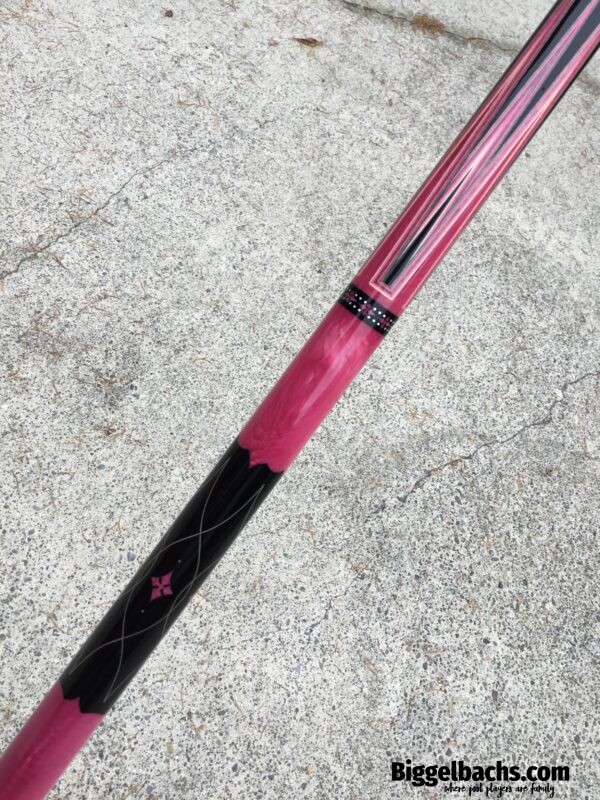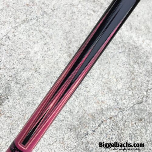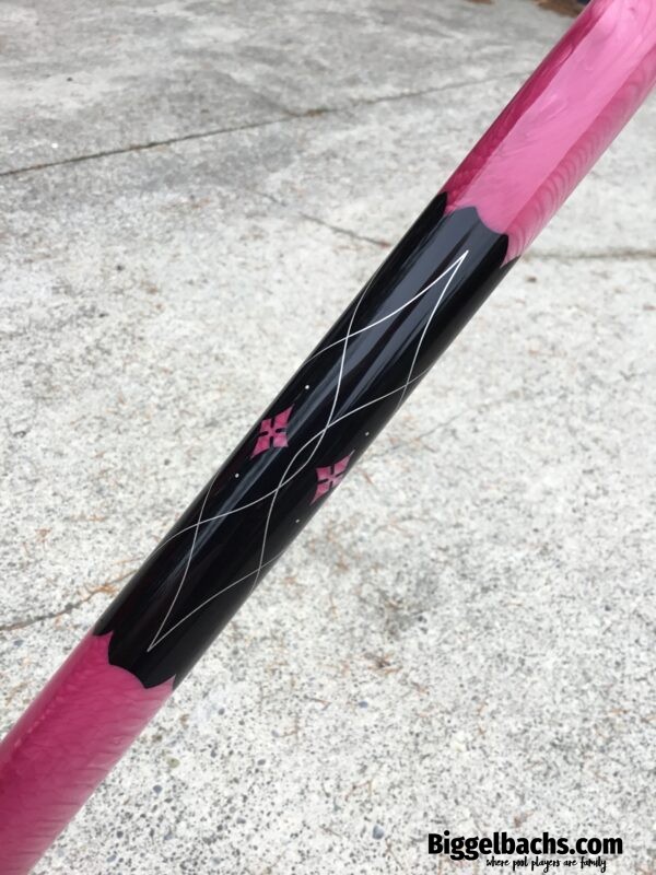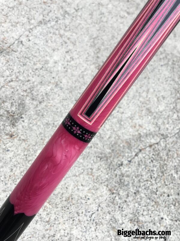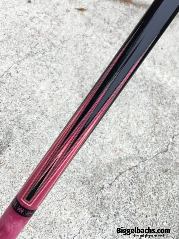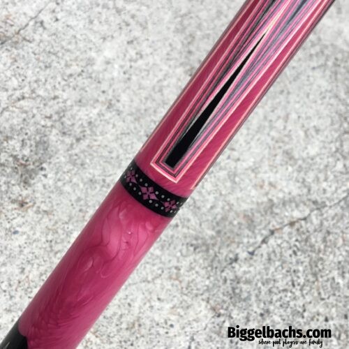 As we have said before, the owner of this Shelby Williams cue will be finding new details to appreciate for quite some time! This cue will also stand out in the collection display case or the pool hall, it in fact would look other-worldly with a carbon shaft! Ebony sets the backdrop for pink juma inlays complimented by silver. The high-low ebony points framed by pink and white bridged veneers are just one special element of this over the top cue, we’ll leave it to you to appreciate the rest!