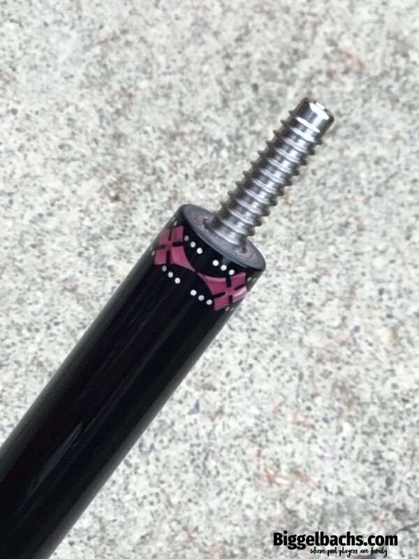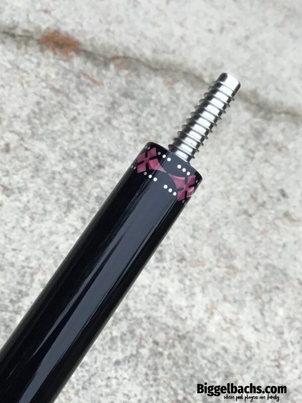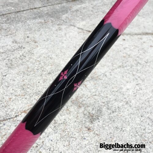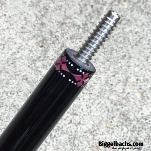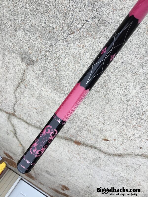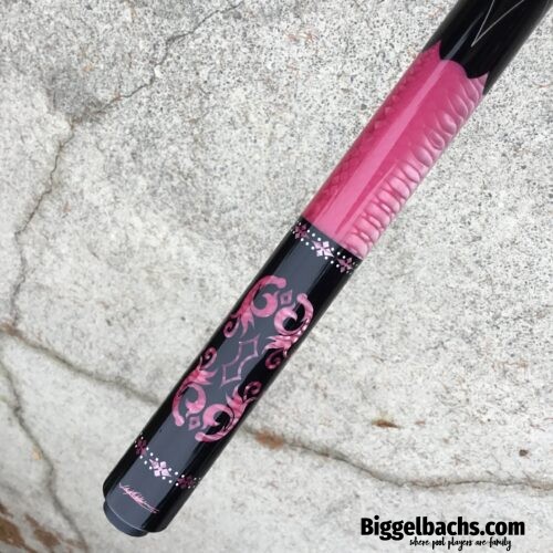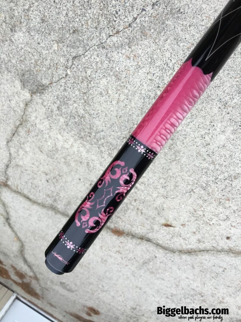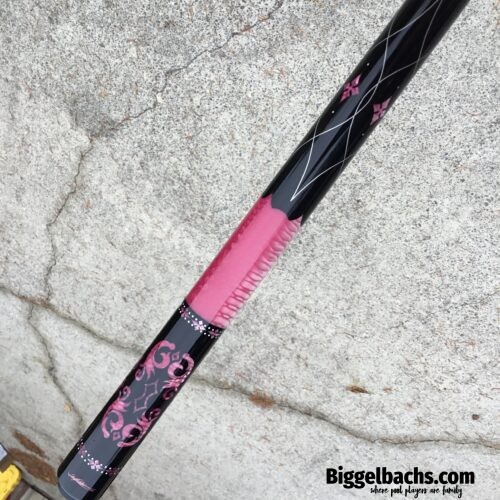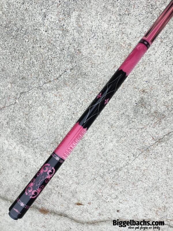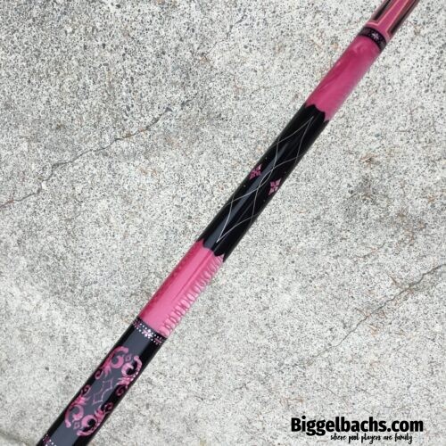 As we have said before, the owner of this Shelby Williams cue will be finding new details to appreciate for quite some time! This cue will also stand out in the collection display case or the pool hall, it in fact would look other-worldly with a carbon shaft! Ebony sets the backdrop for pink juma inlays complimented by silver. The high-low ebony points framed by pink and white bridged veneers are just one special element of this over the top cue, we’ll leave it to you to appreciate the rest!