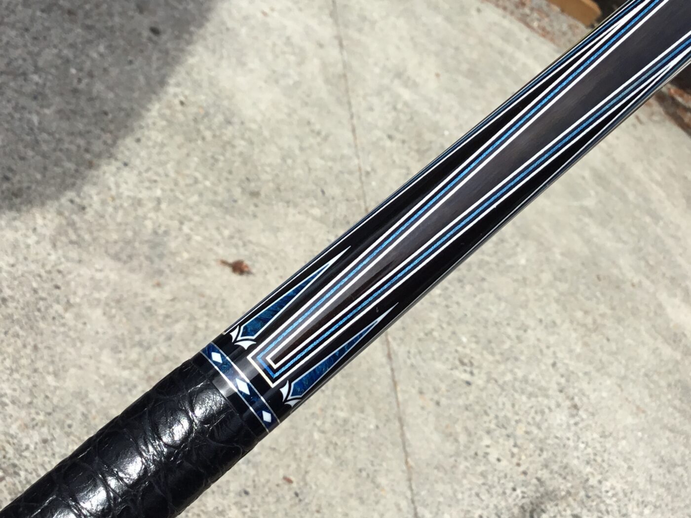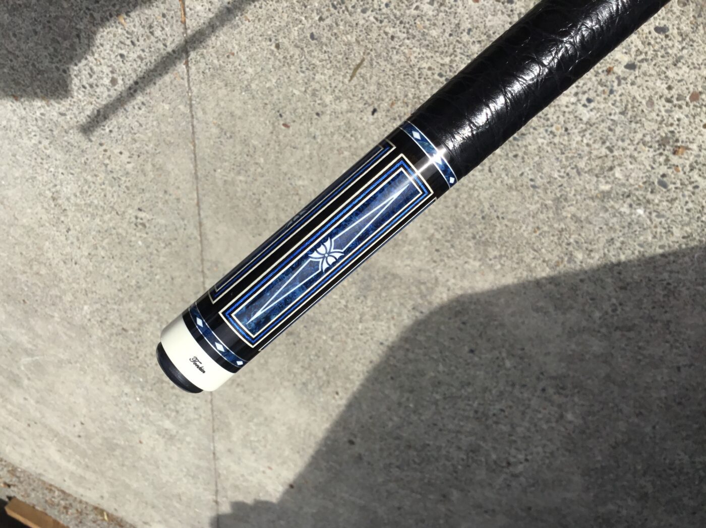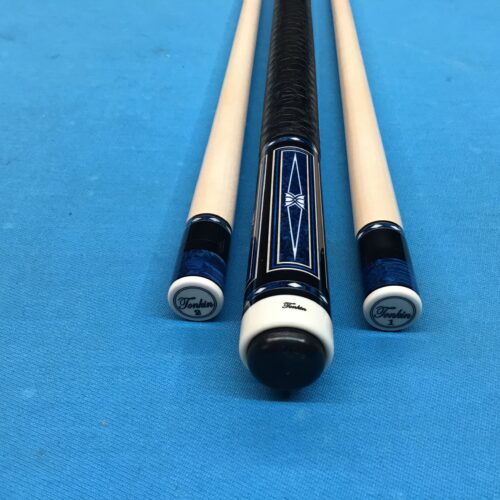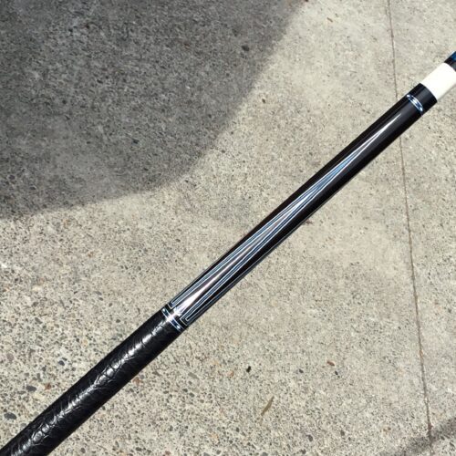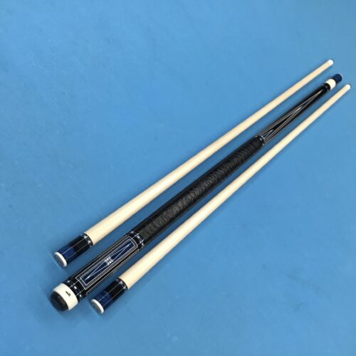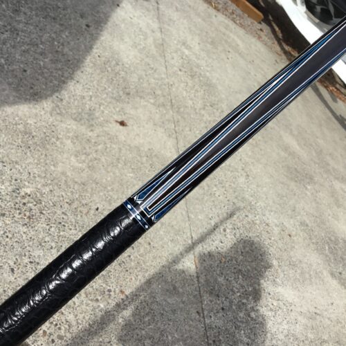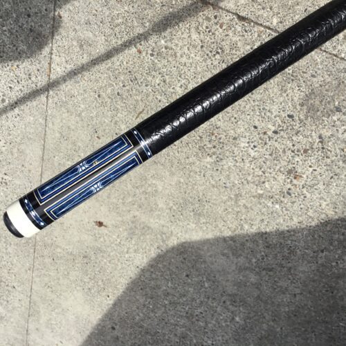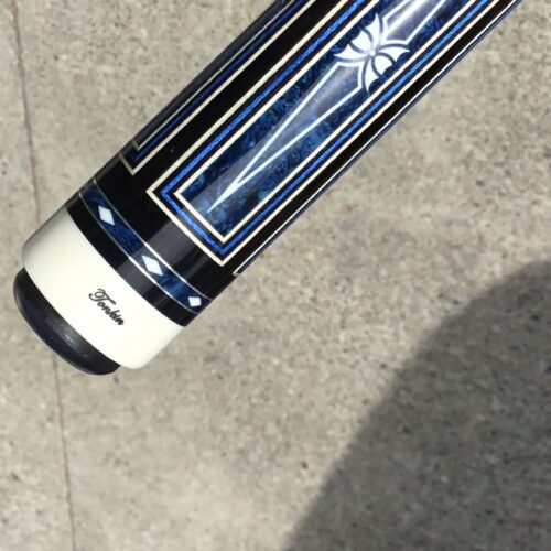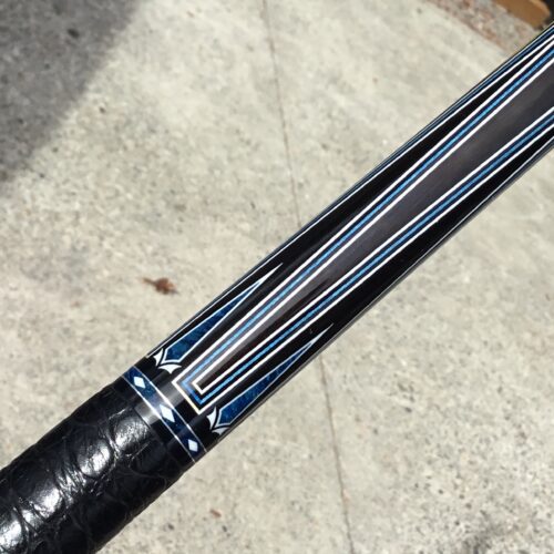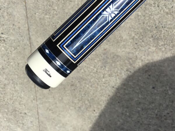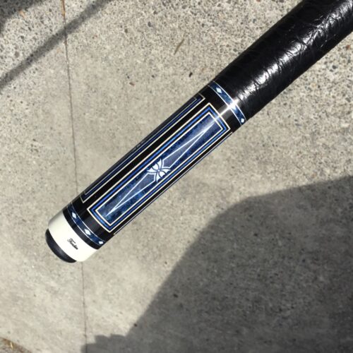 Incredible blue bridged points on ebony! In addition, Tonkin performs his magic with intricate blue stone inlays complimented with ivorine starbursts. Pete finishes this cue art off with a textured leather wrap that feels soft and just perfect!