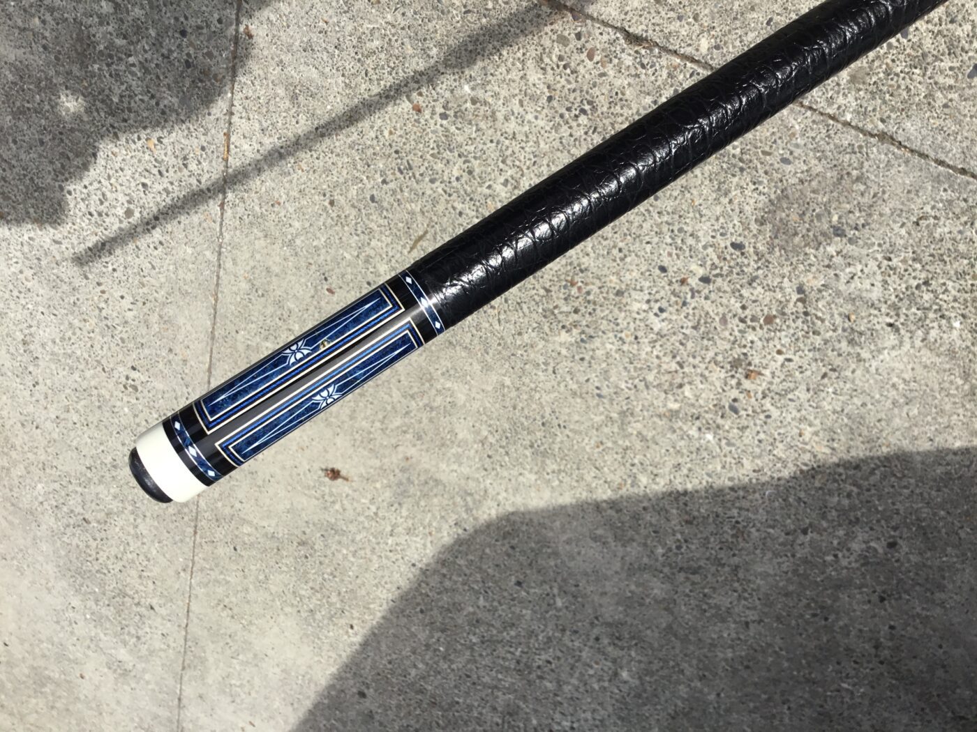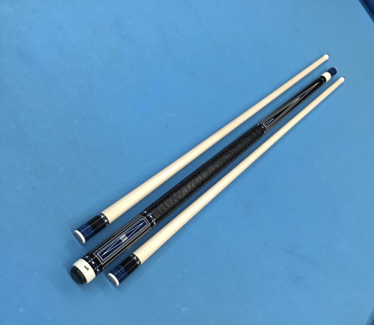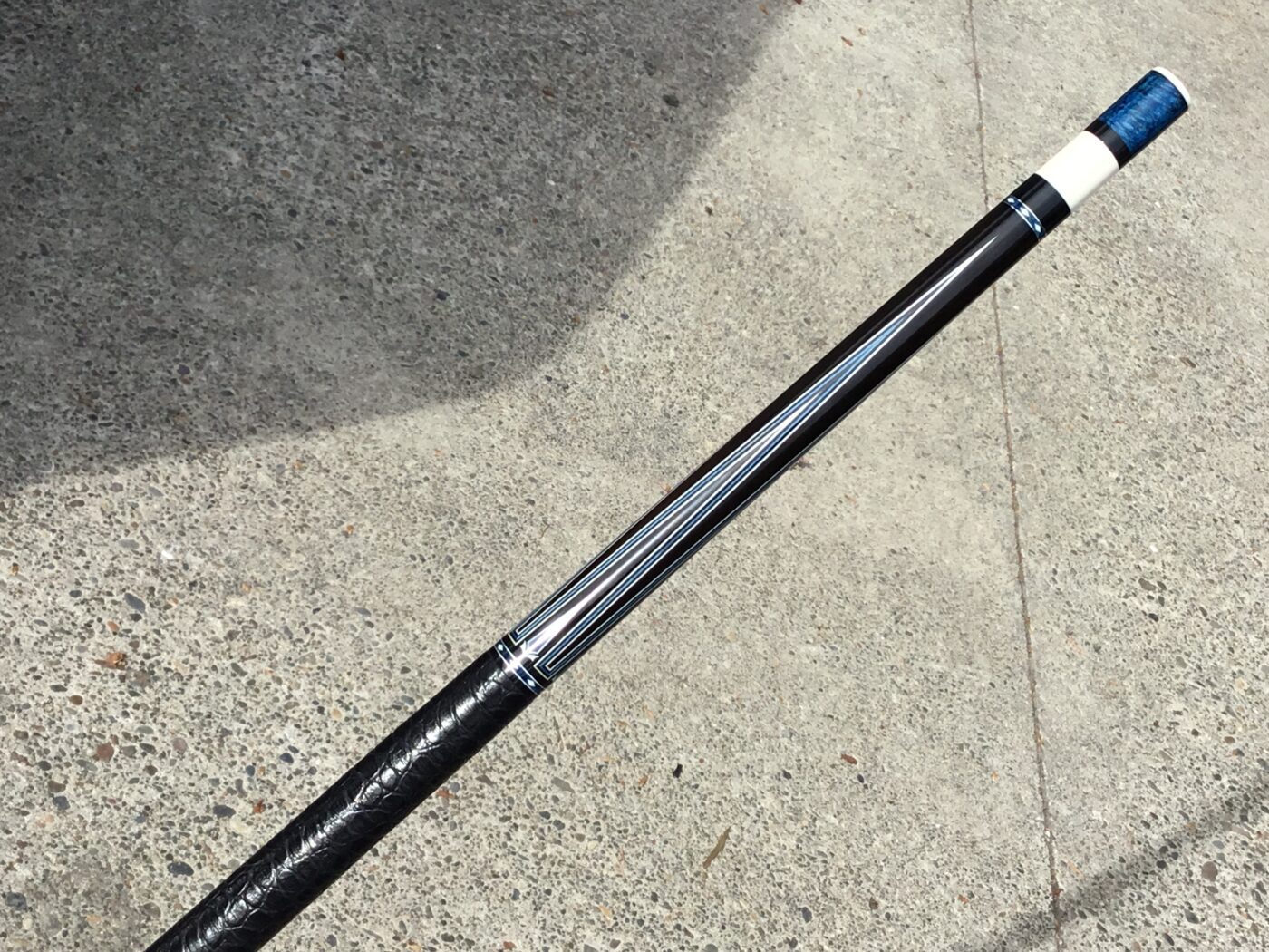 Incredible blue bridged points on ebony! In addition, Tonkin performs his magic with intricate blue stone inlays complimented with ivorine starbursts. Pete finishes this cue art off with a textured leather wrap that feels soft and just perfect!