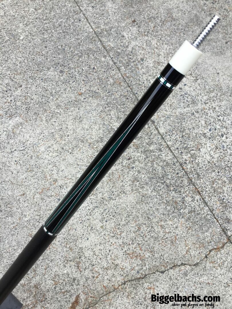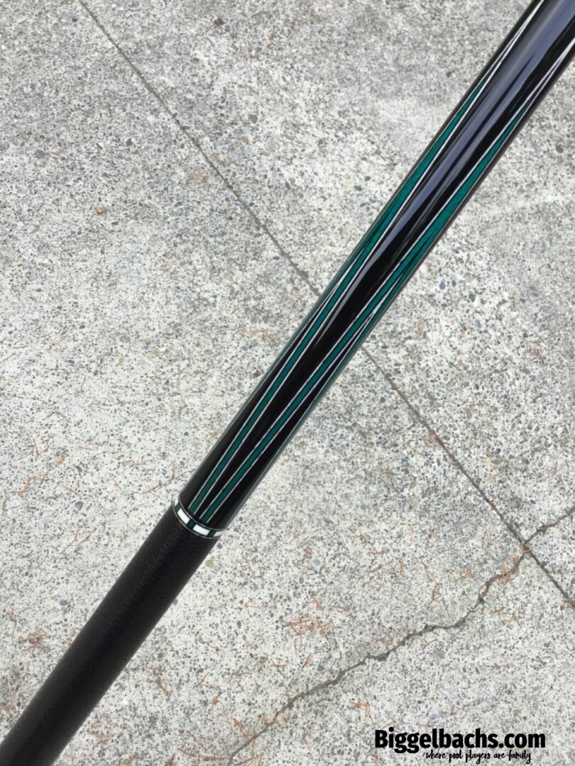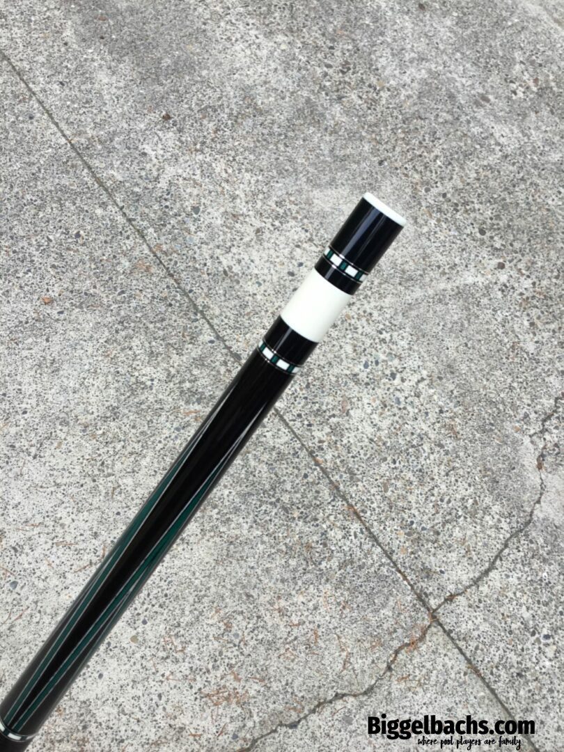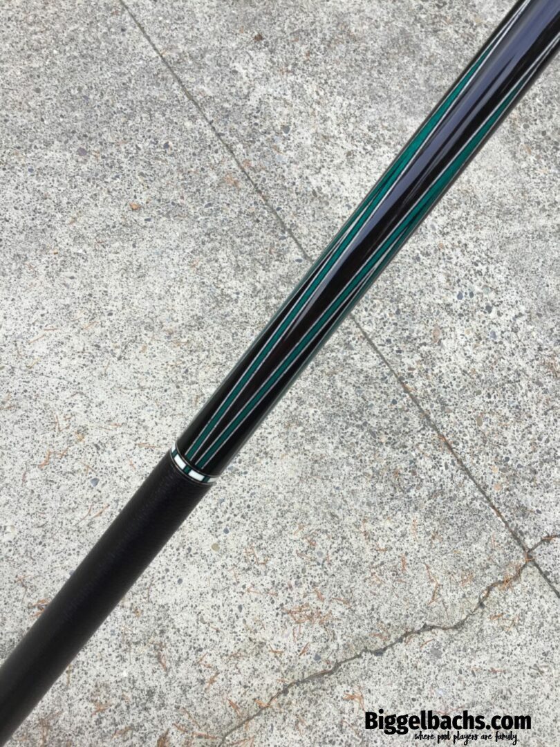 We don’t feel like the pictures do this cue justice. The green veneers on the ebony are incredibly striking and really give the cue its own 3-D effect.