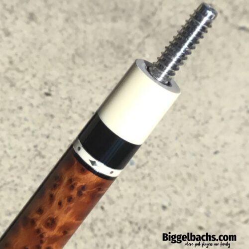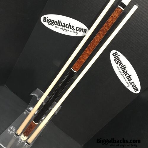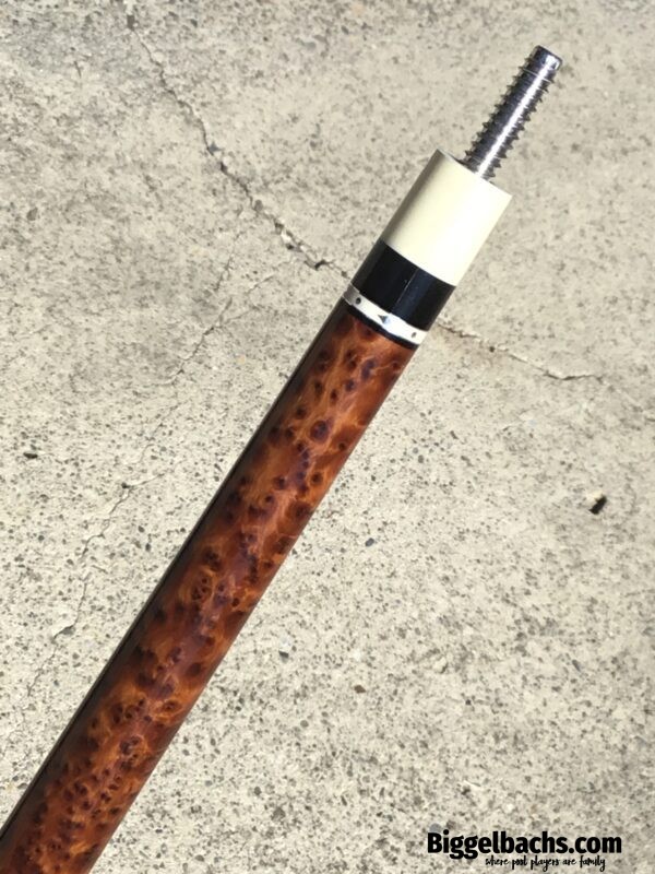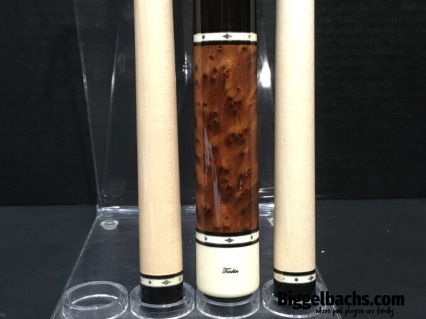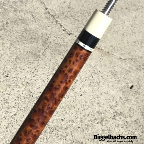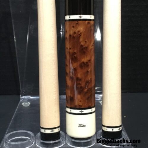 Doing too much to this incredible piece of Thuya Burl would be criminal, and Pete Tonkin practically writes the laws at such a prestigious level of cue making! So this Merry Widow build is perfectly complimented with copper diamonds in the collars, and no wrap ebony handle. The cue is new with 2 shafts.