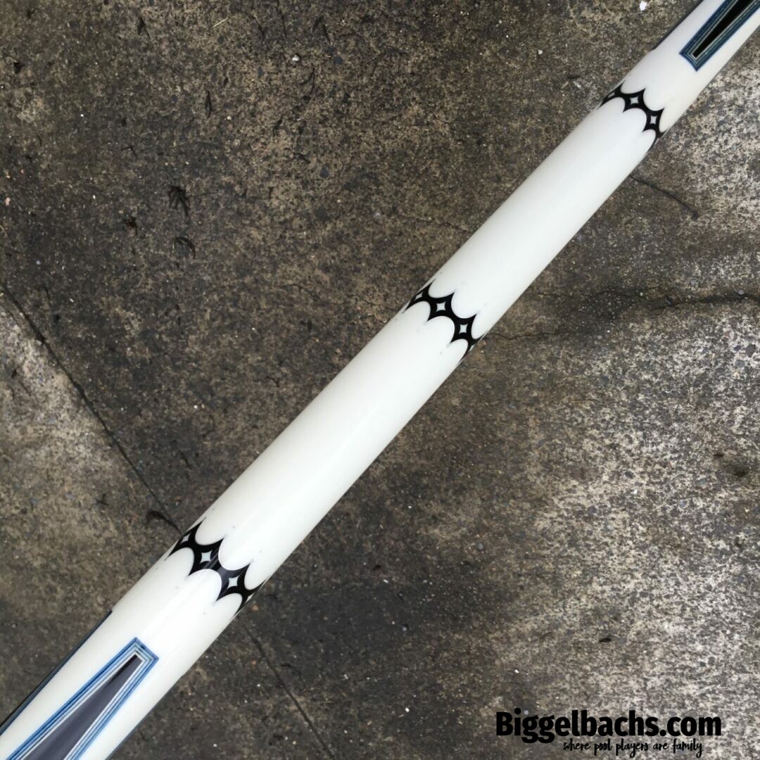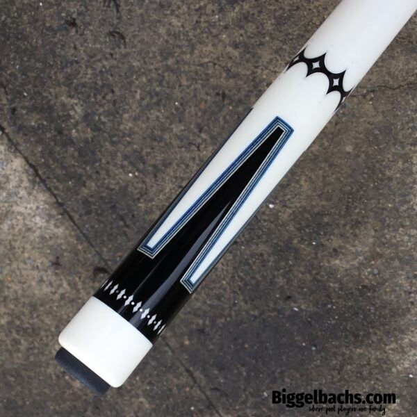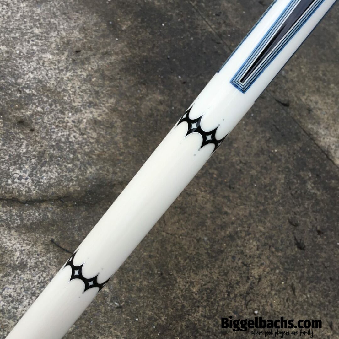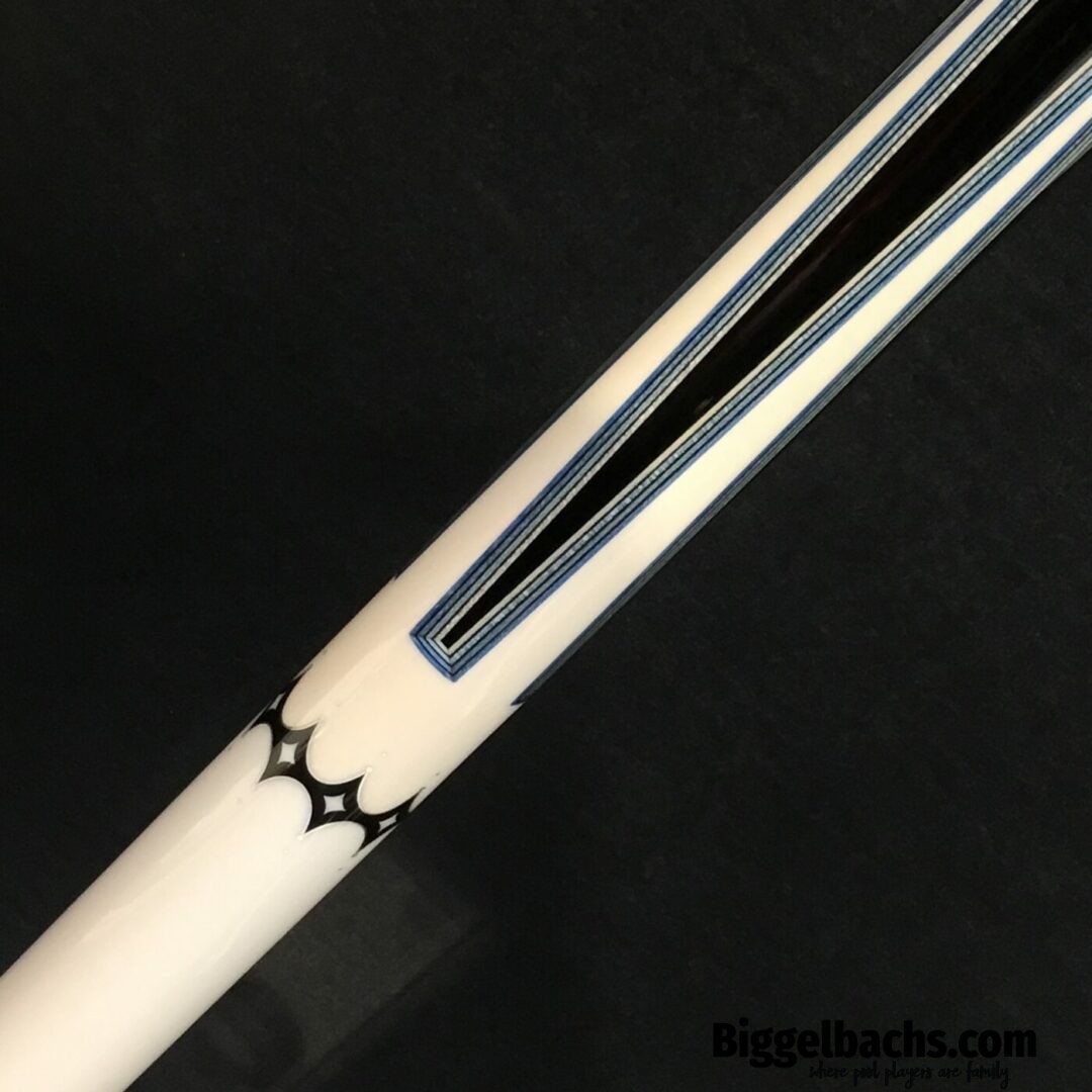Arguably one of the biggest cues out there, this build is other-worldly! As is often the case, pictures cannot capture the details and beauty of this build, not even close. For instance, there are silver pin head inlays above and below every single scalloped diamond! The scallops are silver, and the diamonds inside the scallops are outlined by silver. Oh yeah, and did we talk about the hourglass diamonds the joint and top of the butt cap? The cool silver, grey, blue veneers and bridges are simply artistic genius. We can only say “Wow”!