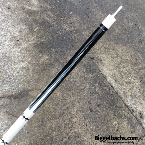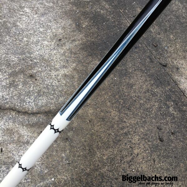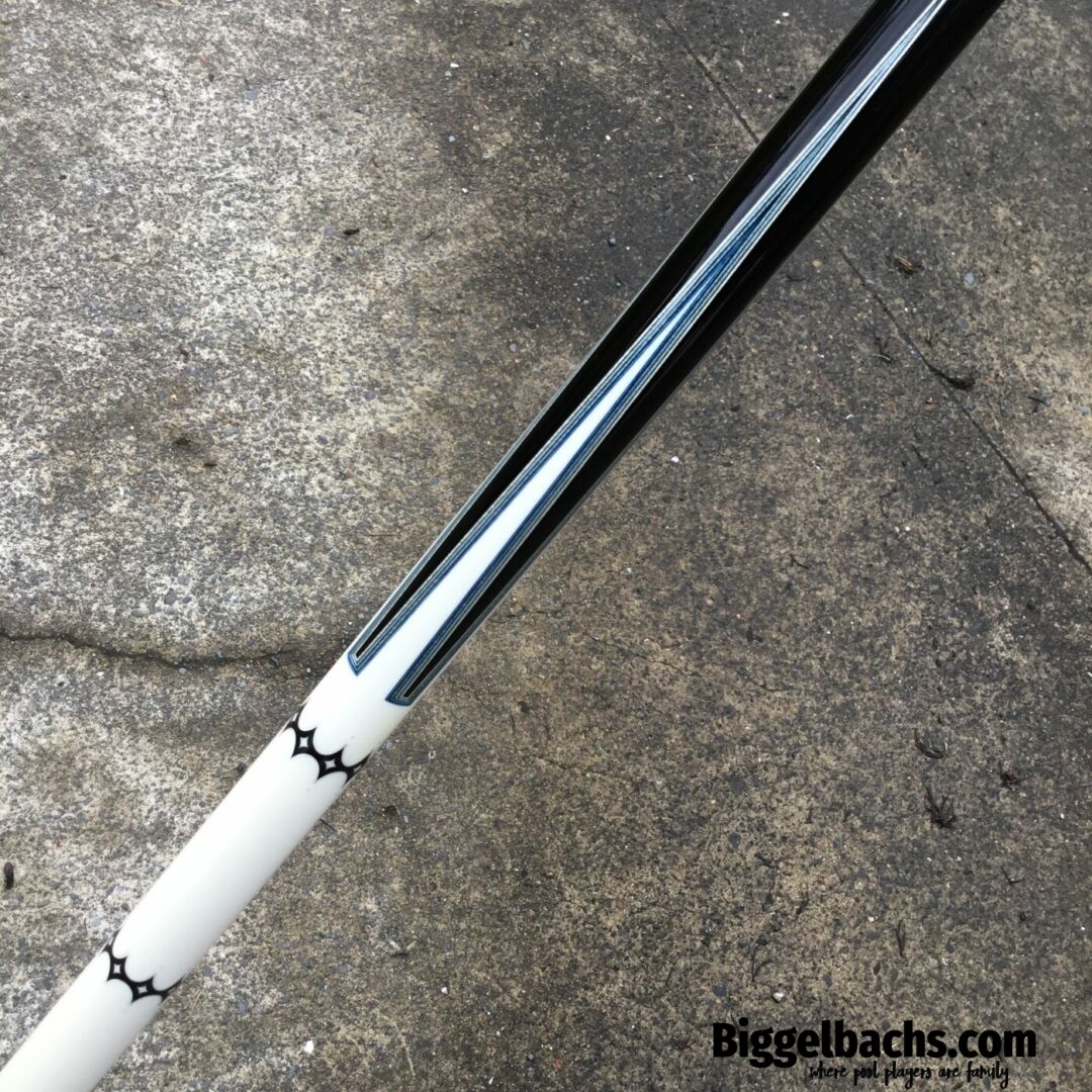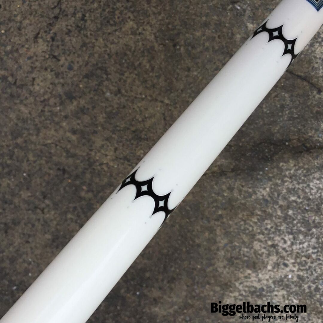 Arguably one of the biggest cues out there, this build is other-worldly! As is often the case, pictures cannot capture the details and beauty of this build, not even close. For instance, there are silver pin head inlays above and below every single scalloped diamond! The scallops are silver, and the diamonds inside the scallops are outlined by silver. Oh yeah, and did we talk about the hourglass diamonds the joint and top of the butt cap? The cool silver, grey, blue veneers and bridges are simply artistic genius. We can only say “Wow”!