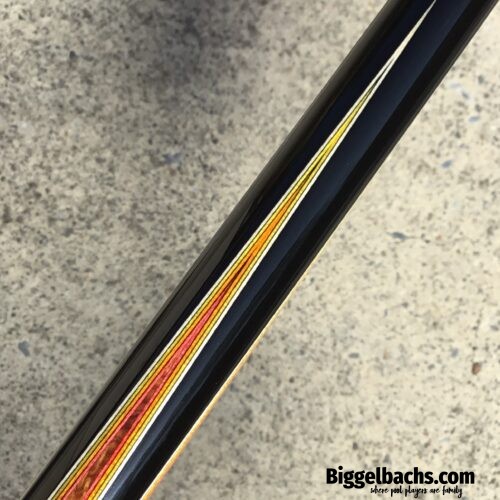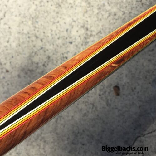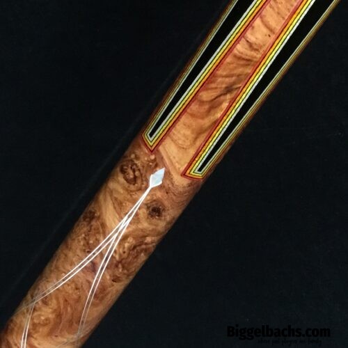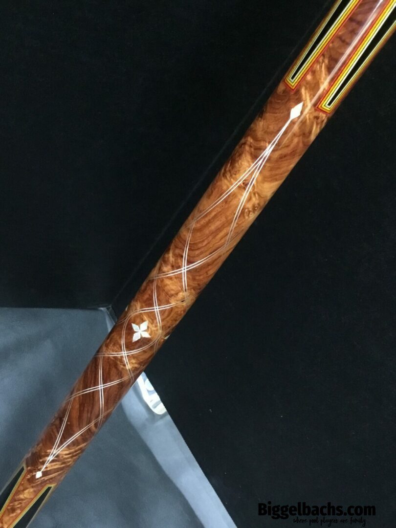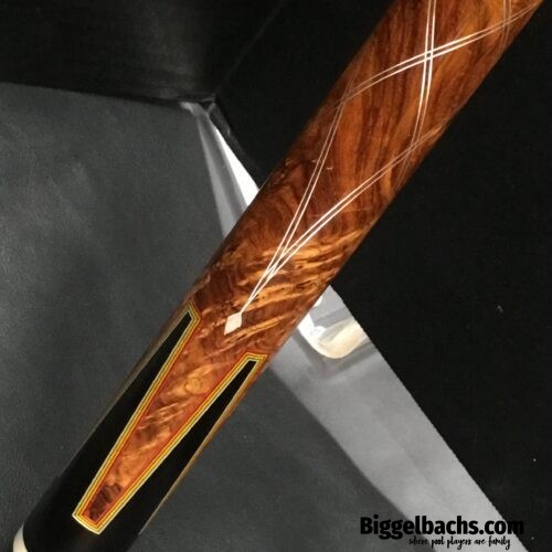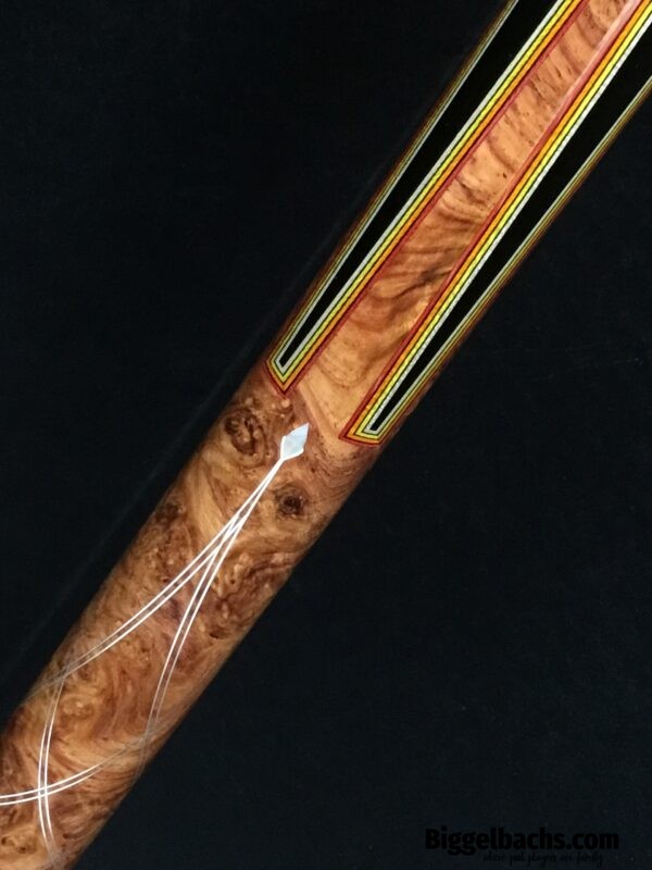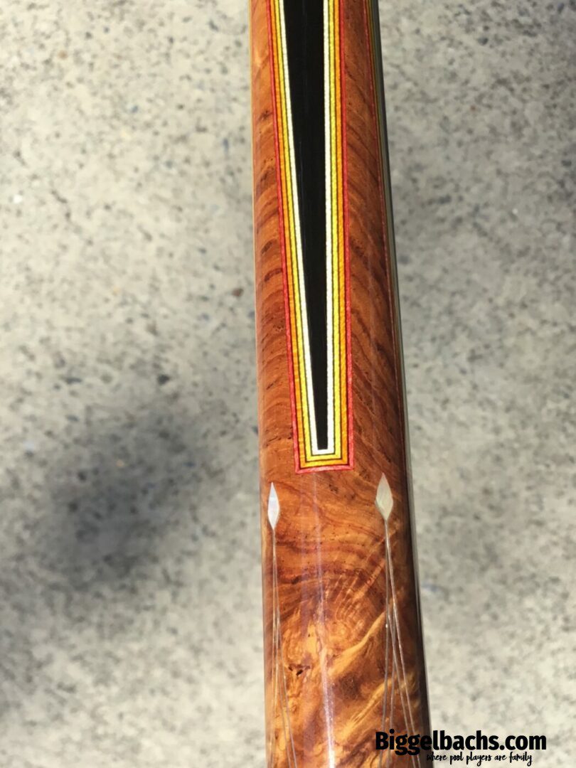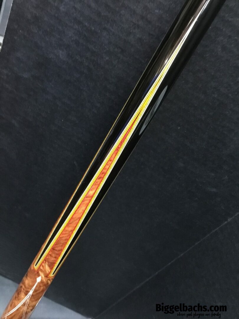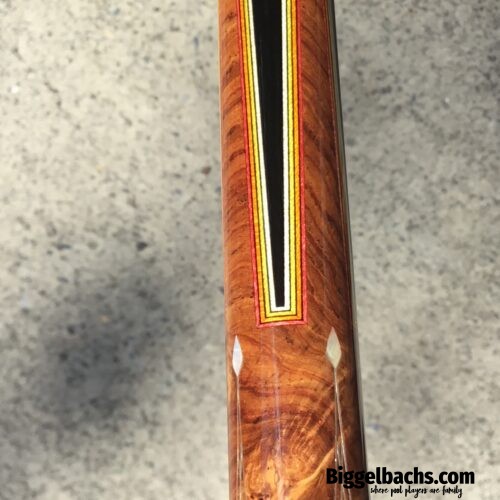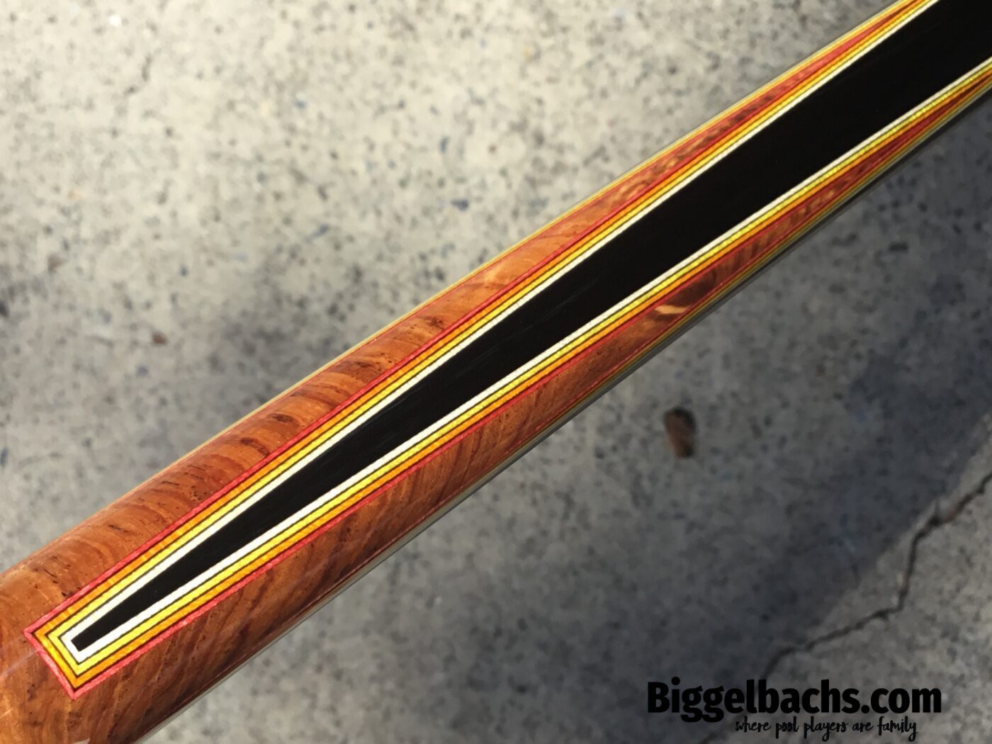 This Larry Vigus cue is hotter than a Texas afternoon in mid-August! Big cues or small, this one might just come in as the Biggelbachs favorite! The burl in this build is absolutely sick in all the best ways, and the ebony and red and yellow veneers set off all the other design elements like fireworks in the summer sky! And yet we still have to pay homage to the double intertwining silver with mother of pearl flowerette and mini speer inlays. Such a stunner from top to bottom!