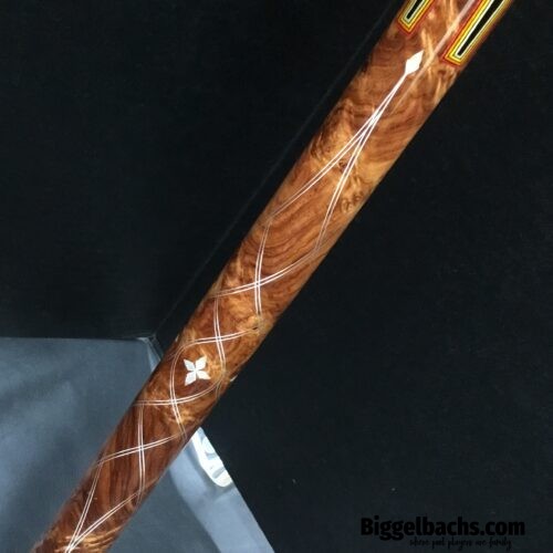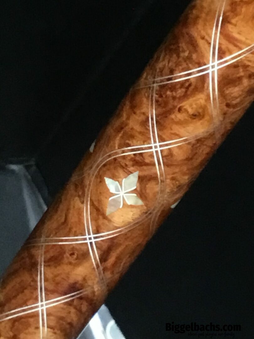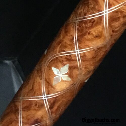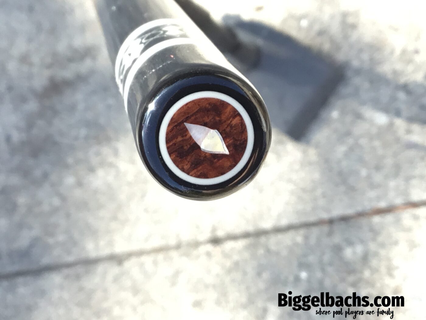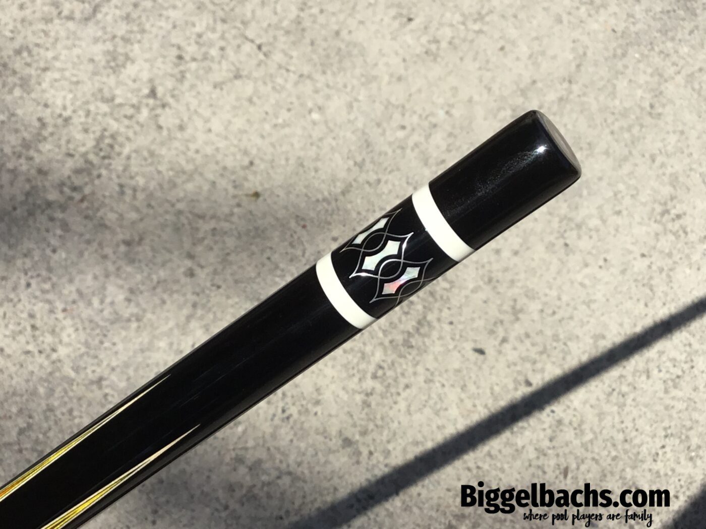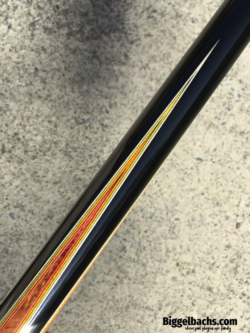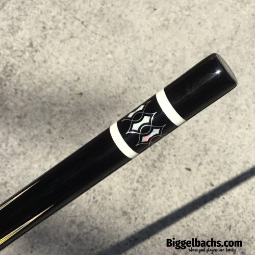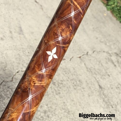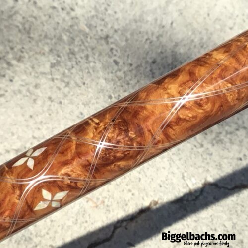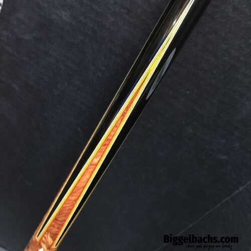 This Larry Vigus cue is hotter than a Texas afternoon in mid-August! Big cues or small, this one might just come in as the Biggelbachs favorite! The burl in this build is absolutely sick in all the best ways, and the ebony and red and yellow veneers set off all the other design elements like fireworks in the summer sky! And yet we still have to pay homage to the double intertwining silver with mother of pearl flowerette and mini speer inlays. Such a stunner from top to bottom!
