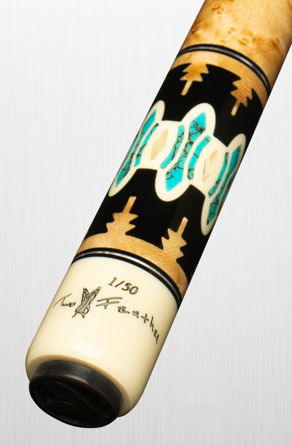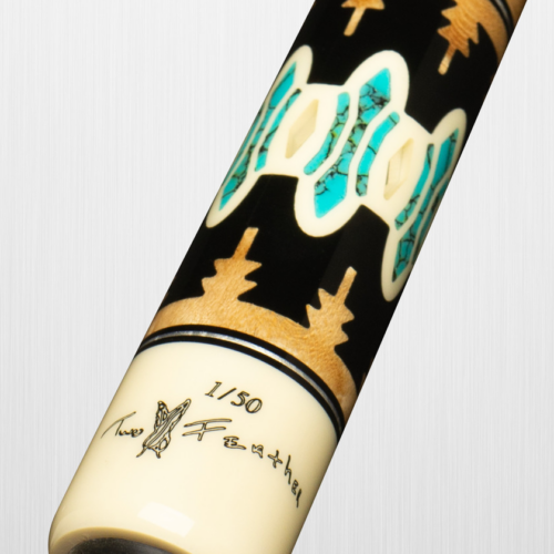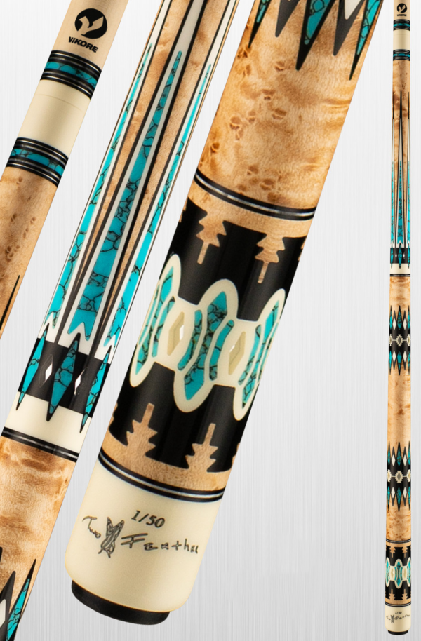 A Viking partnership with world renowned artist Two Feathers proudly presents this heirloom quality cue. Drawing inspiration from indigenous history and the natural beauty of the region, the cue is called, “Havasu Falls” with respect to the Havasupai people who have have lived in Southwesten America for over 800 years. Havasupai means the people of the blue green water represented by a cue featuring over 230 inlays and rings of exclusive pearls, metals, genuine turquoise, mirror and premium birdseye maple; this cue is truly a work of art. Rest assured this cue plays as good as it looks paired with the ViKORE performance shaft and a Tiger Everest tip.